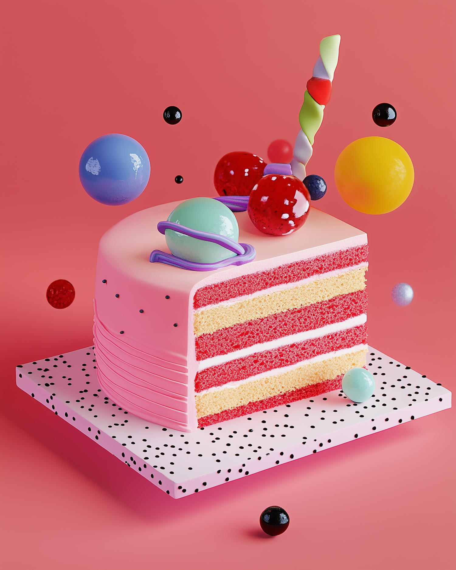 Vibrant cake slice with colorful layers and playful decorations on a polka dot platform against a pink background.