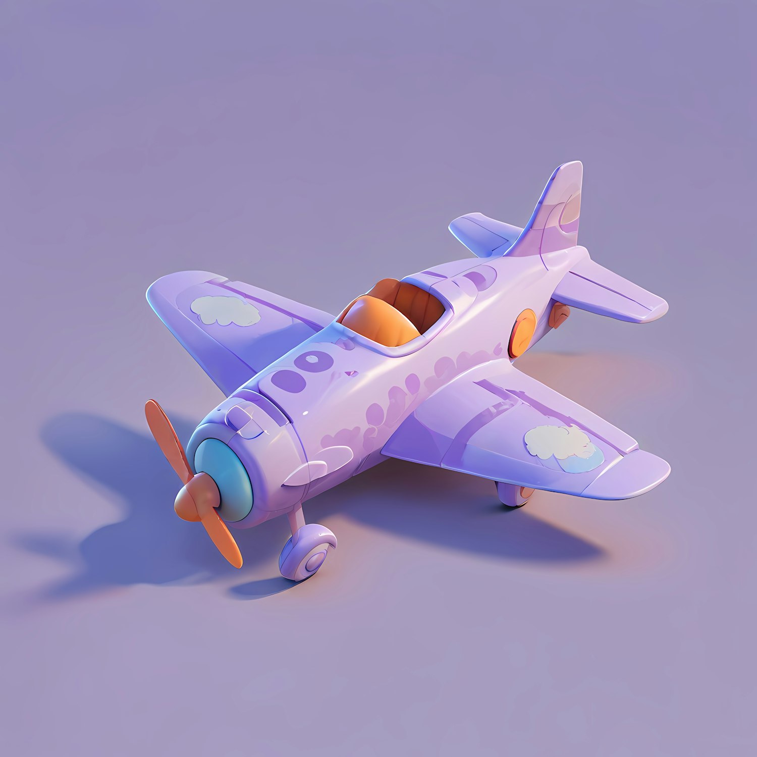 Whimsical lavender cartoon airplane with cloud patterns and orange accents, set against a soft gradient background.