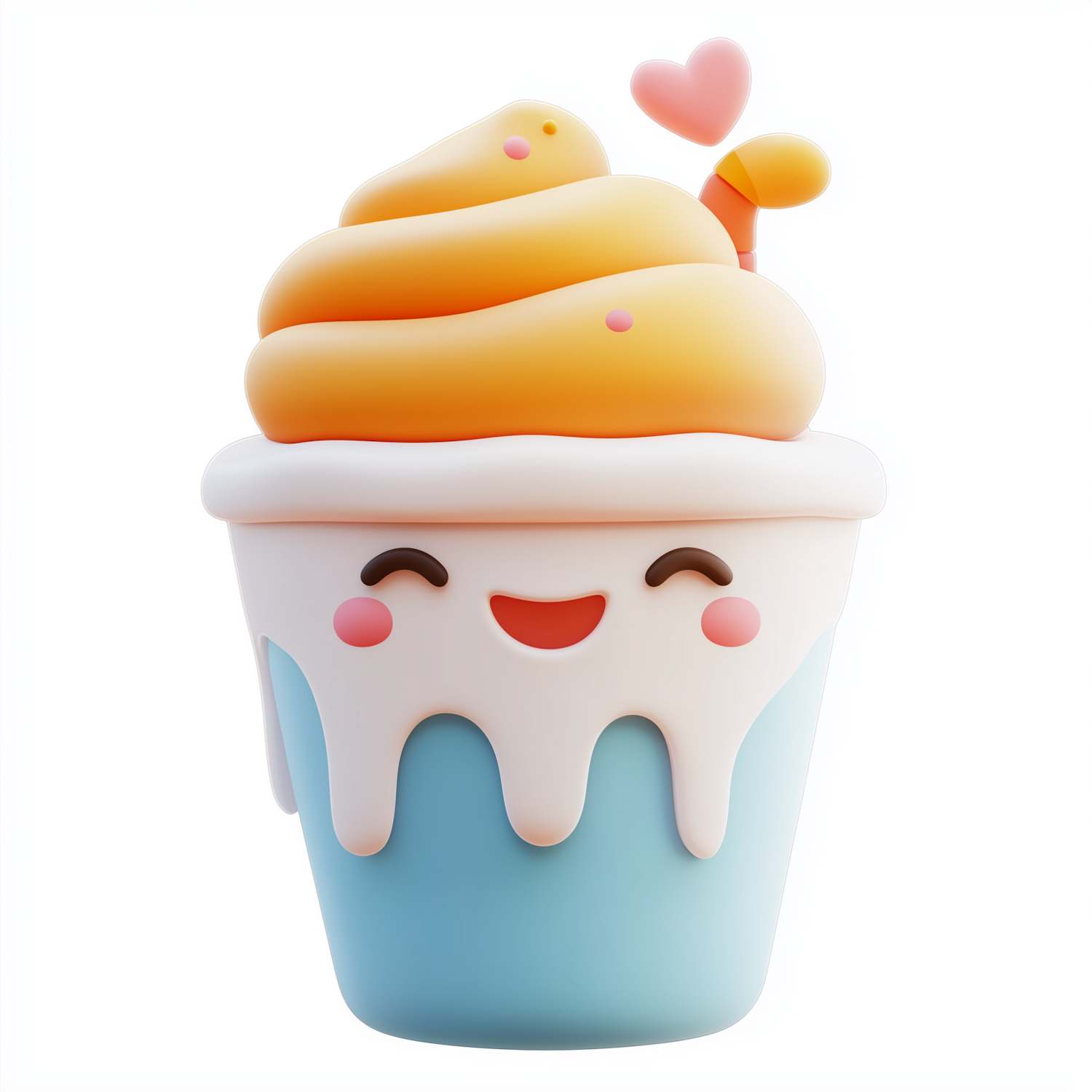 Adorable cartoon cupcake with a smiling face, orange frosting, and playful decorations. Perfect for cute and cheerful designs.