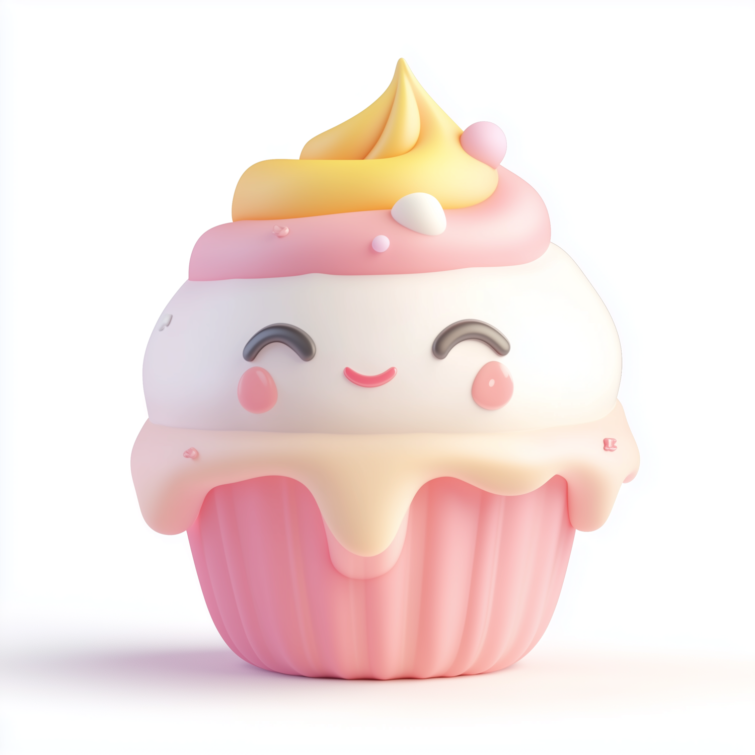 Adorable cartoon cupcake with pink frosting and a smiling face, featuring pastel sprinkles and a cute expression.