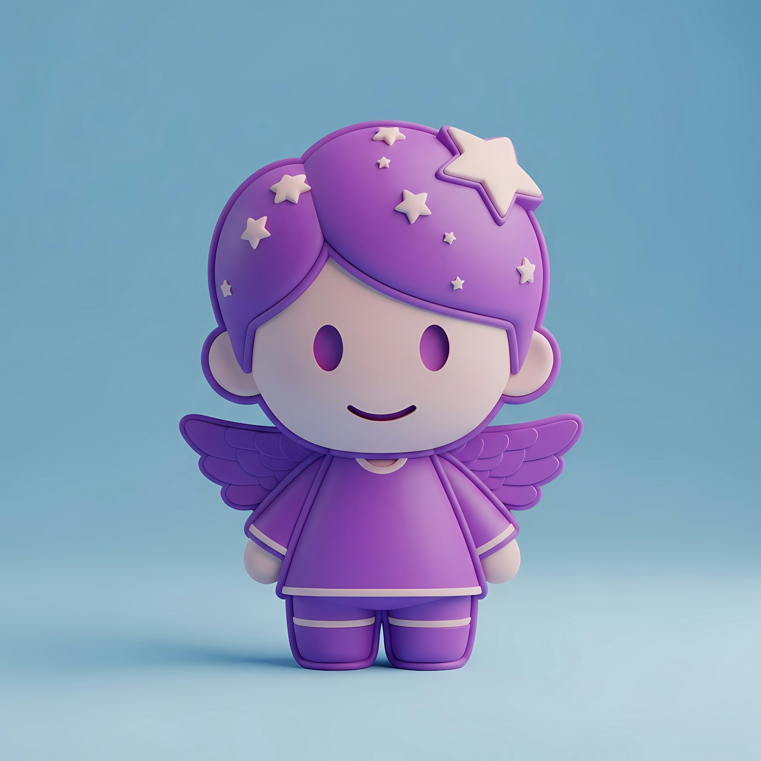 Adorable cartoon character with purple hair, star accents, and angel wings, set against a soft blue background. Perfect for whimsical designs.
