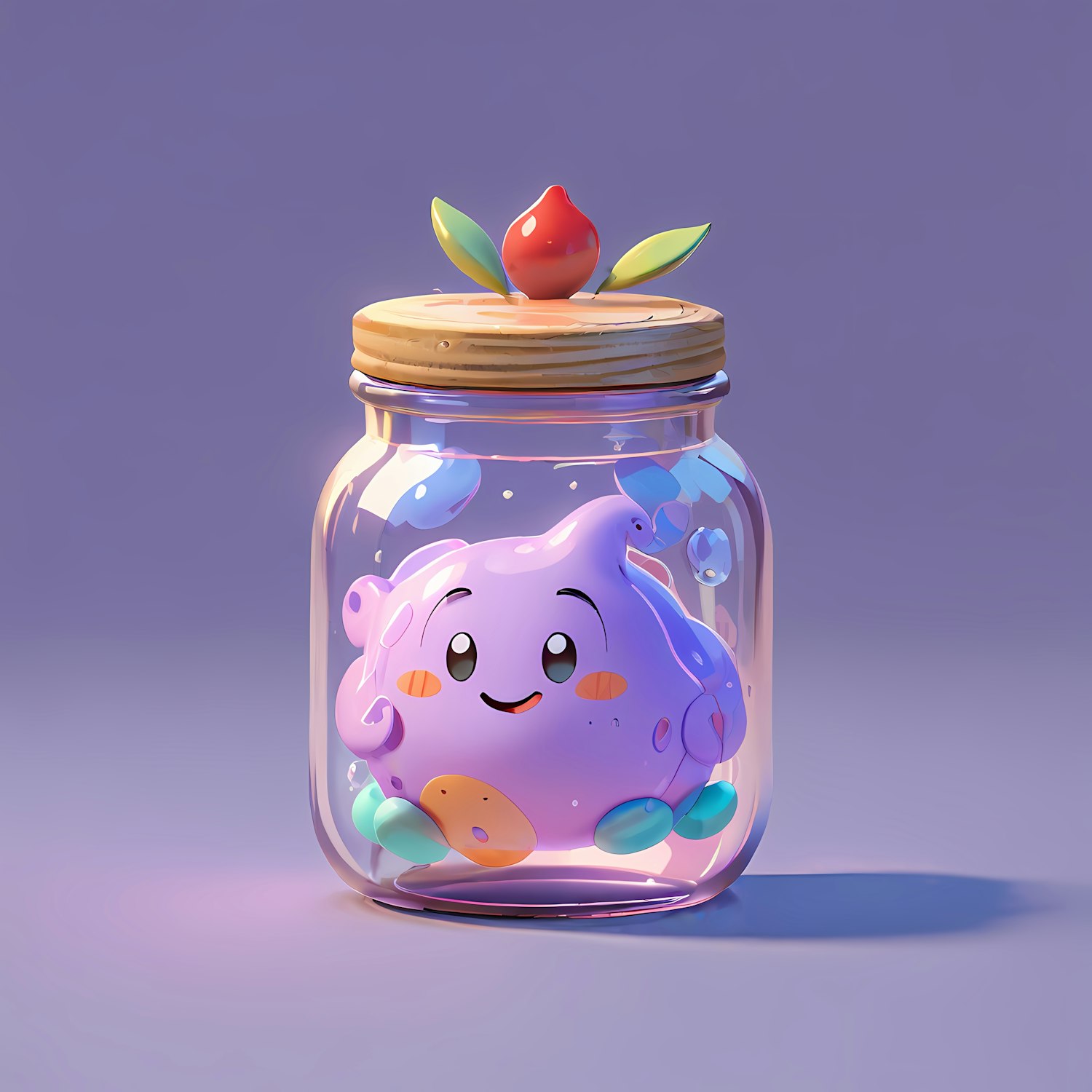 Adorable purple blob character in a jar with a wooden lid, topped with a red fruit. Whimsical and playful design on a purple background.