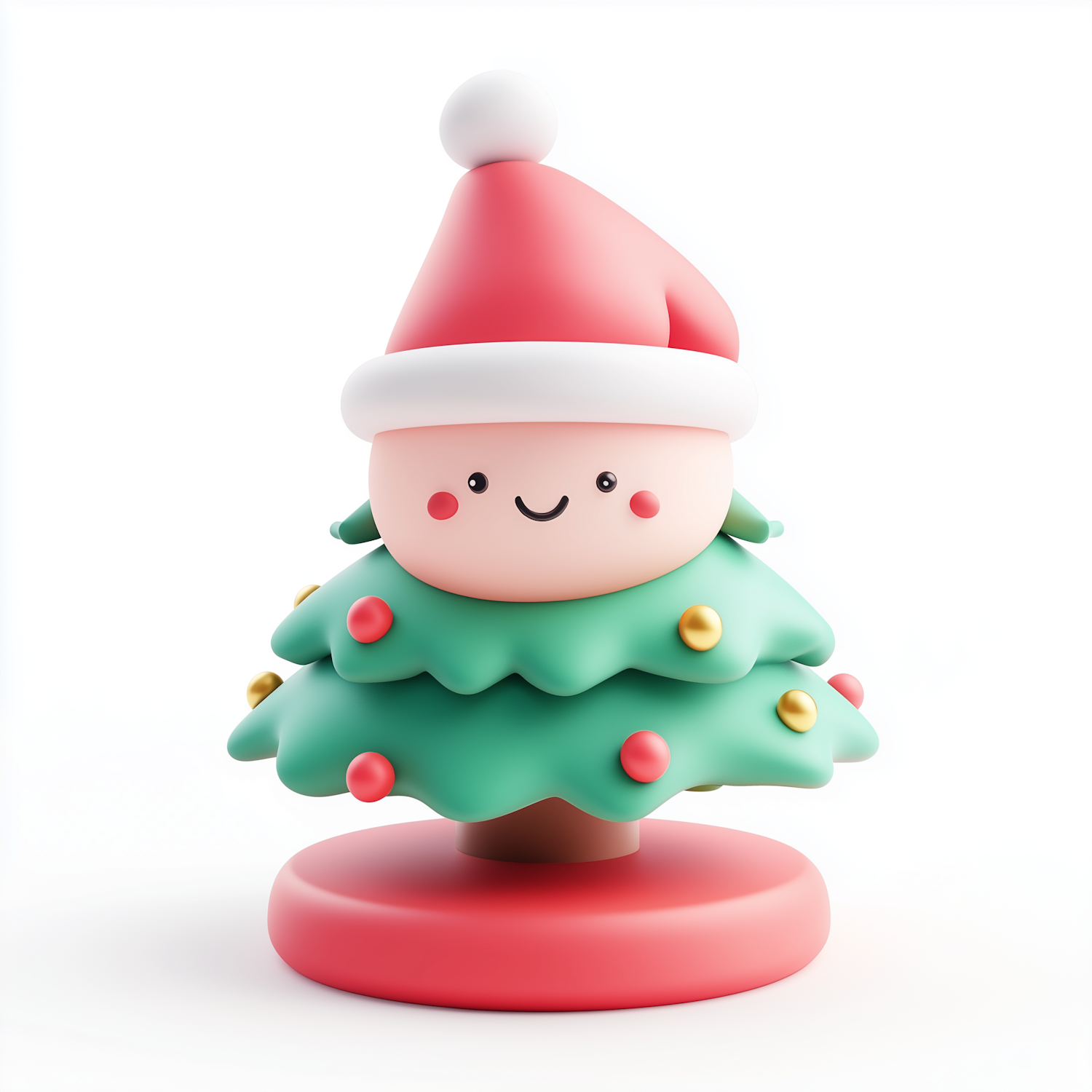 Adorable cartoon Christmas tree character with a Santa hat and colorful ornaments on a white background.