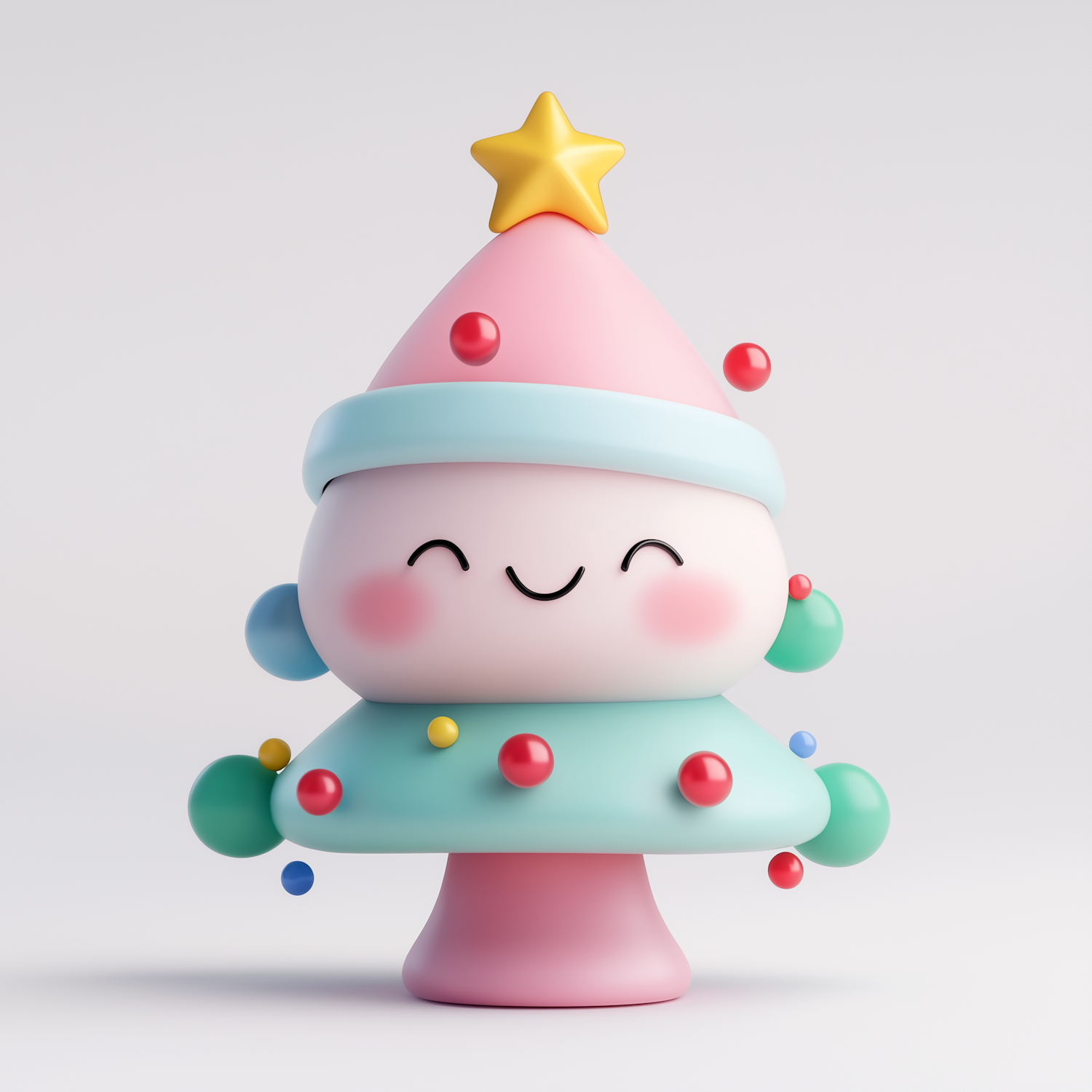 Adorable cartoon Christmas tree with pastel colors, smiling face, and colorful ornaments. Perfect for festive and cheerful designs.