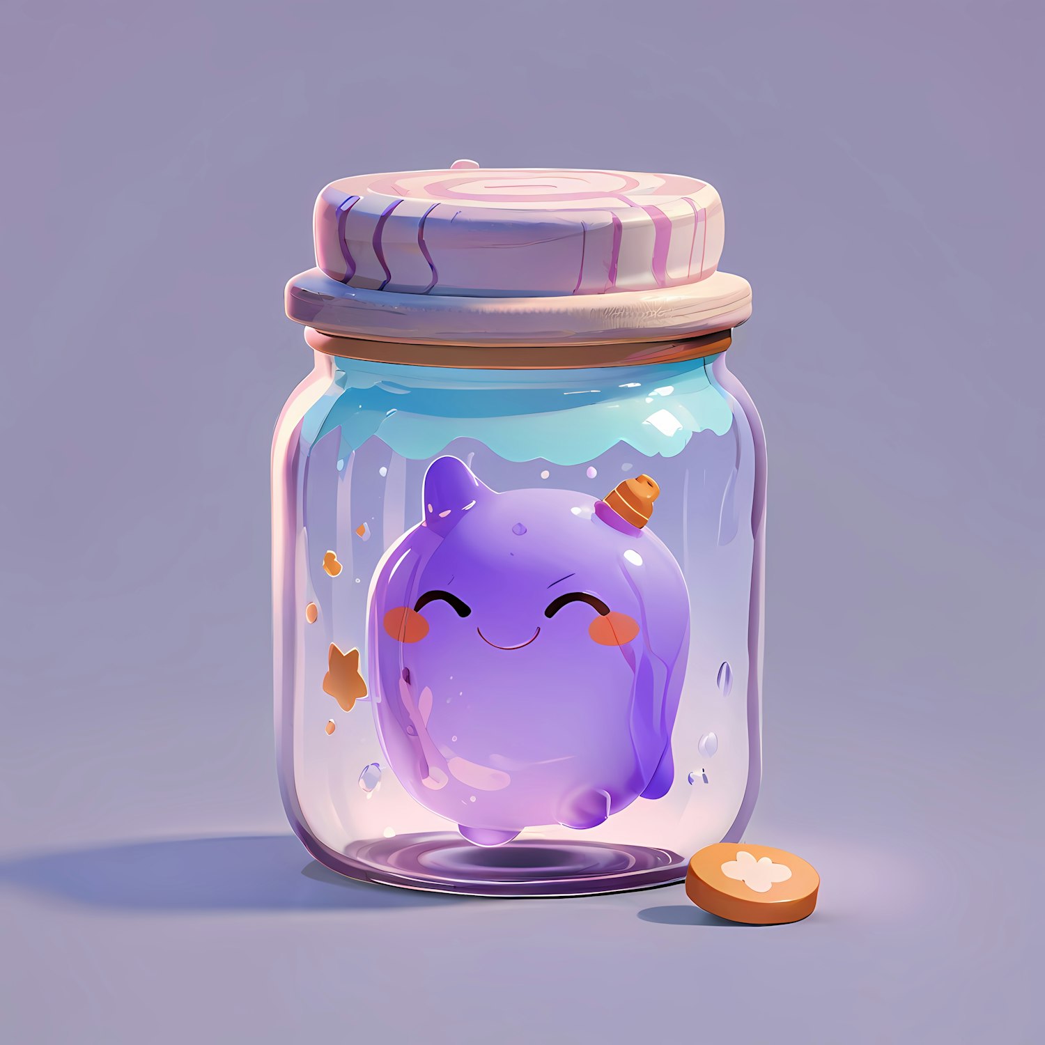 Cute purple creature with a smiling face in a jar, surrounded by star shapes. Whimsical and magical illustration.