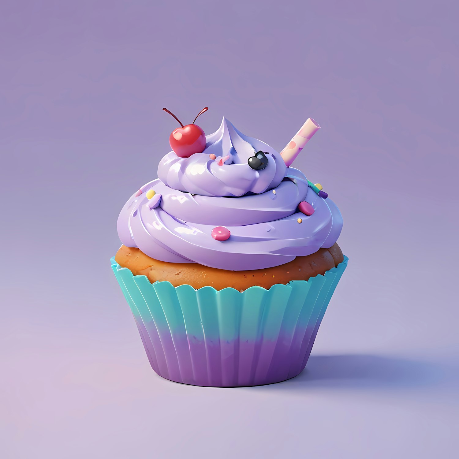 Whimsical cupcake with purple frosting, colorful sprinkles, cherry, and straw in a gradient wrapper against a lavender background.