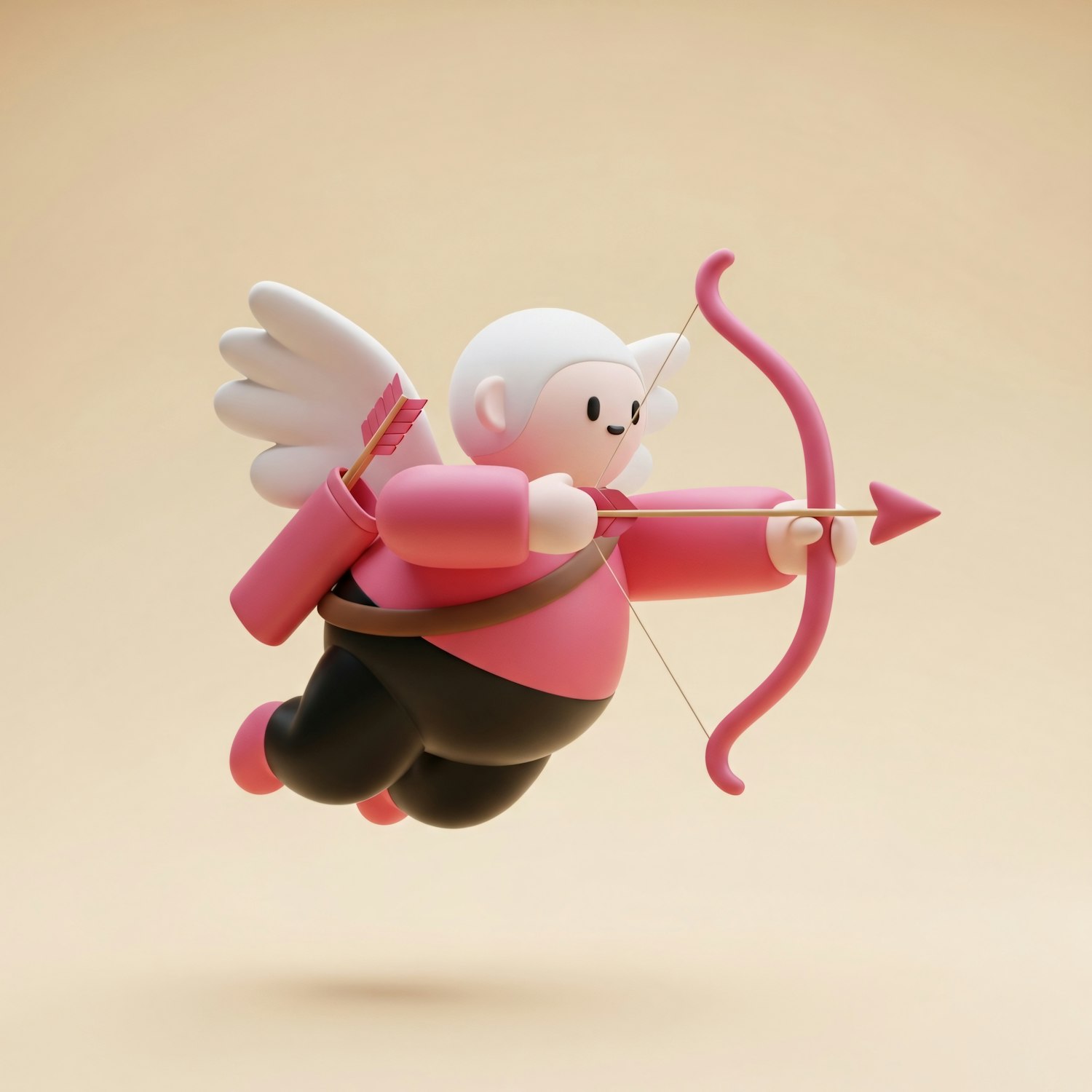 A cute 3D Cupid character with wings, a pink bow and arrow, and a cheerful expression, set against a soft beige background.