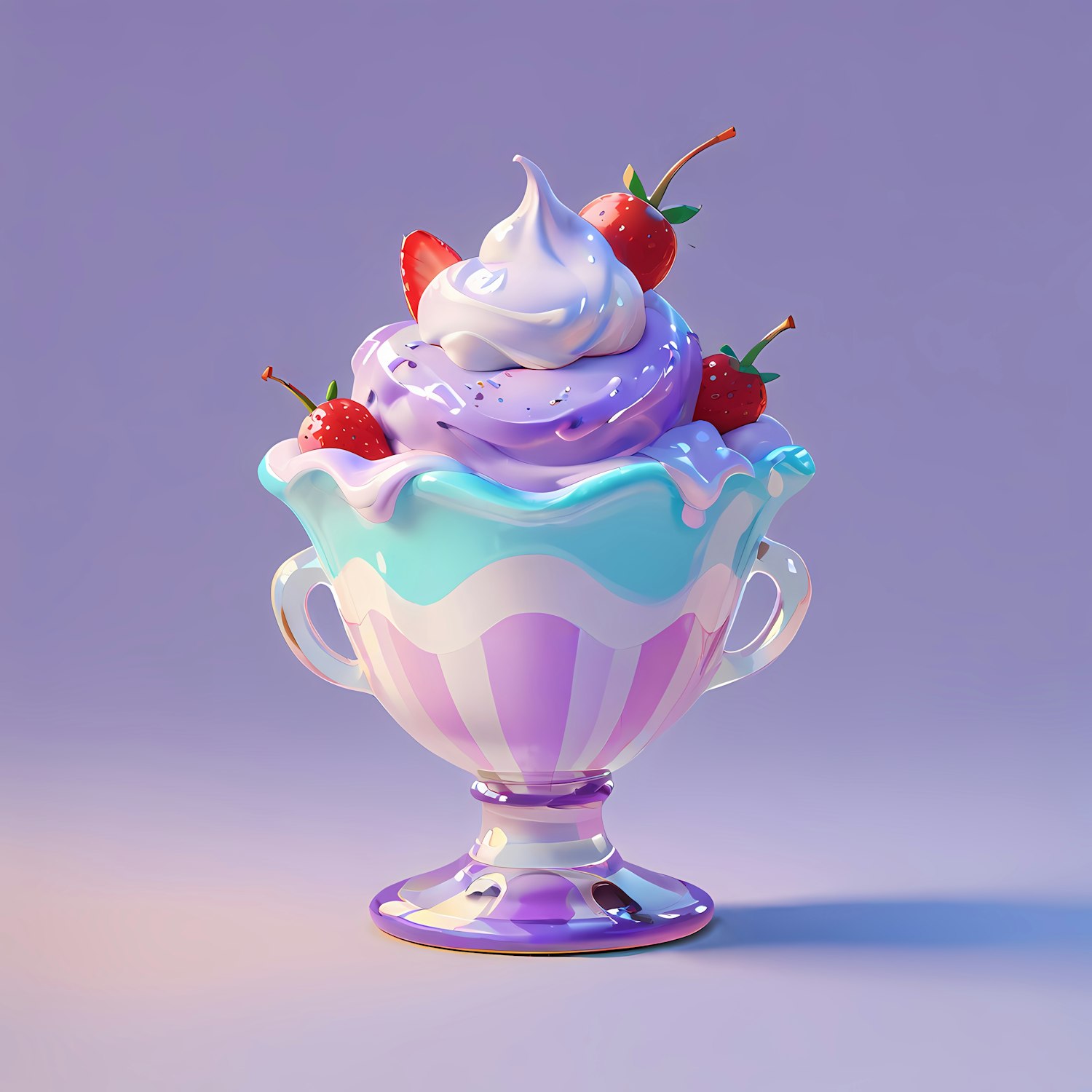 Whimsical 3D dessert cup with purple ice cream, strawberries, and sprinkles in a pastel-colored cup on a lavender background.