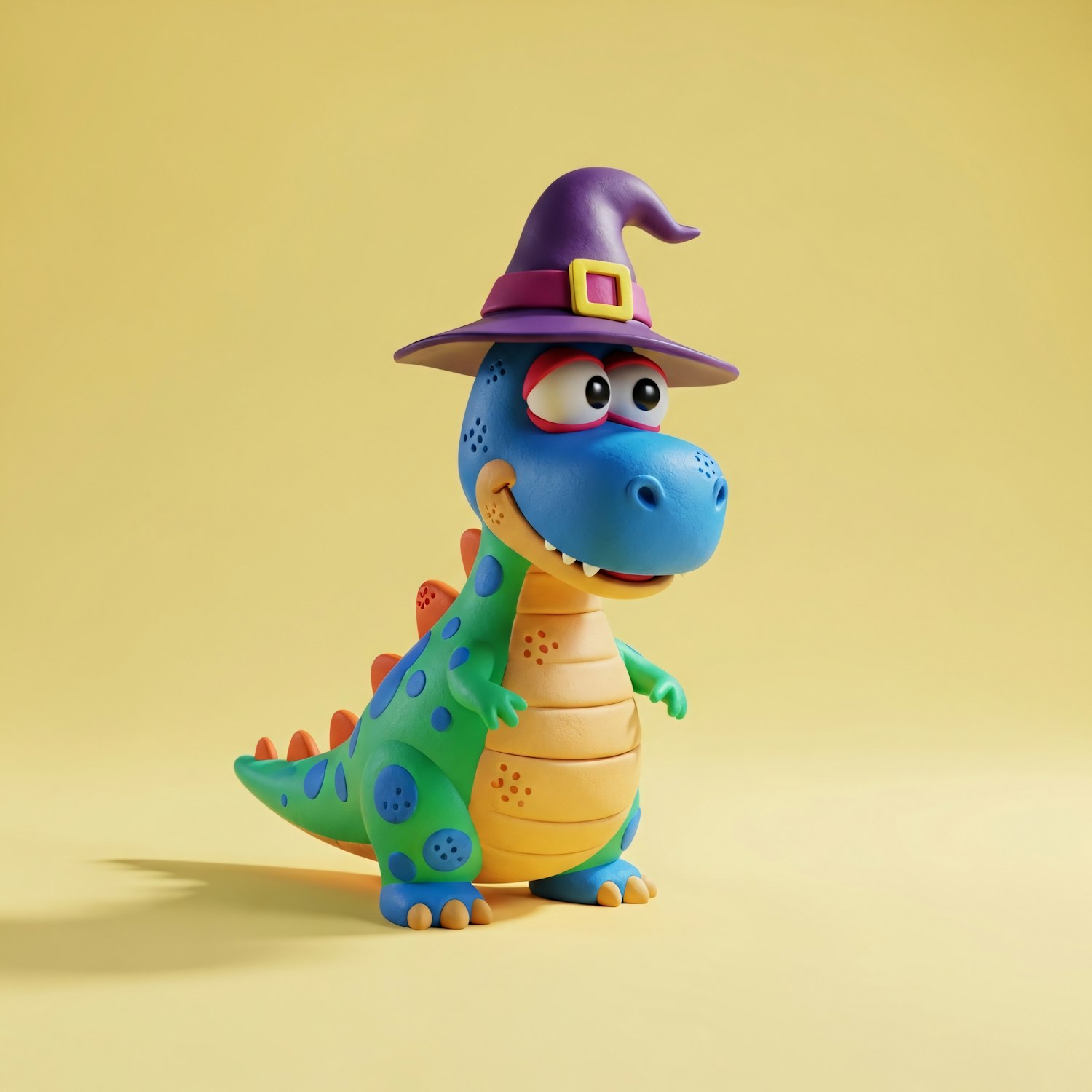 A cute cartoon dinosaur with a witch's hat, vibrant colors, and a cheerful expression on a yellow background.