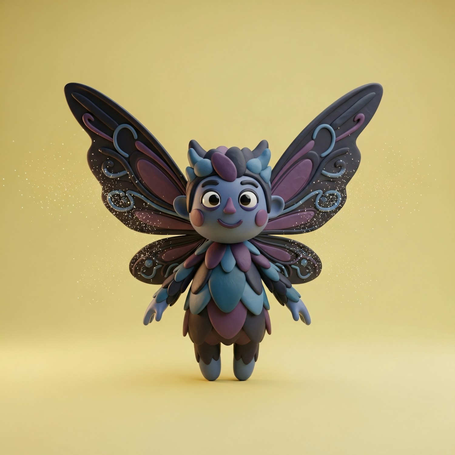 A charming 3D fairy character with colorful wings and a playful design, set against a soft yellow background.