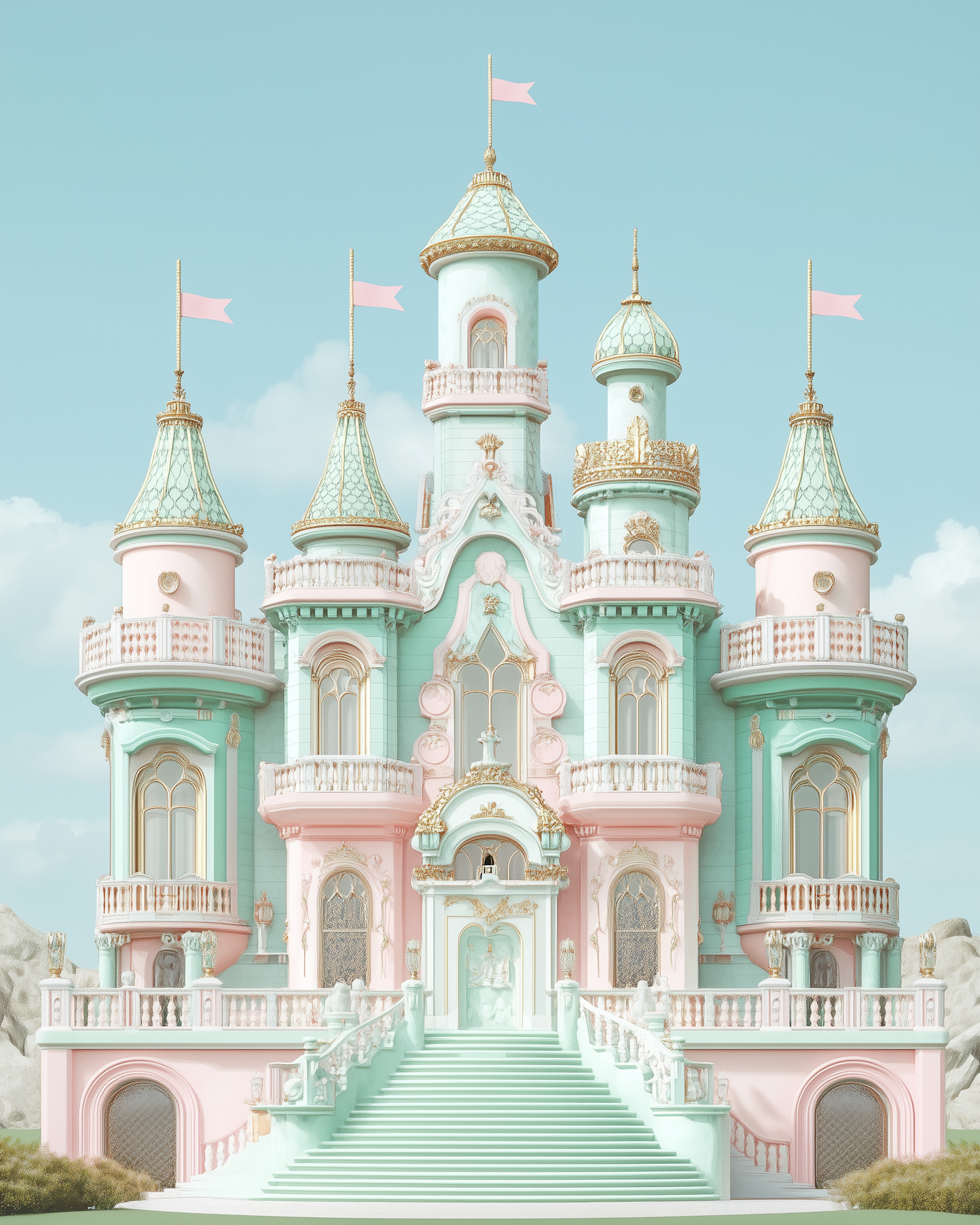 Whimsical pastel castle with pink and mint green hues, golden details, and fluttering flags against a clear blue sky.
