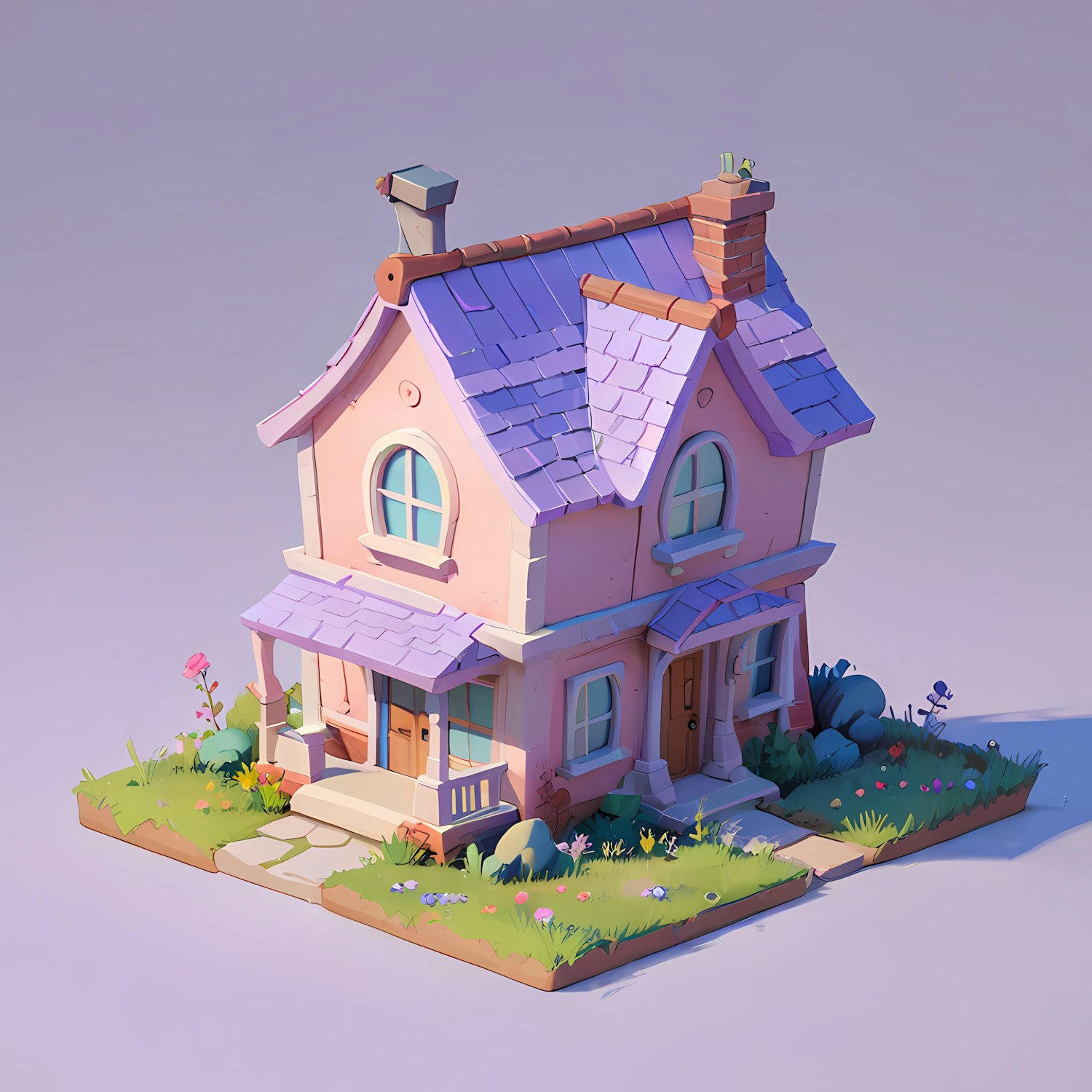 Whimsical cartoon house with pastel colors, purple roof, and lush garden. Charming fairy-tale design with soft lighting and vibrant flowers.