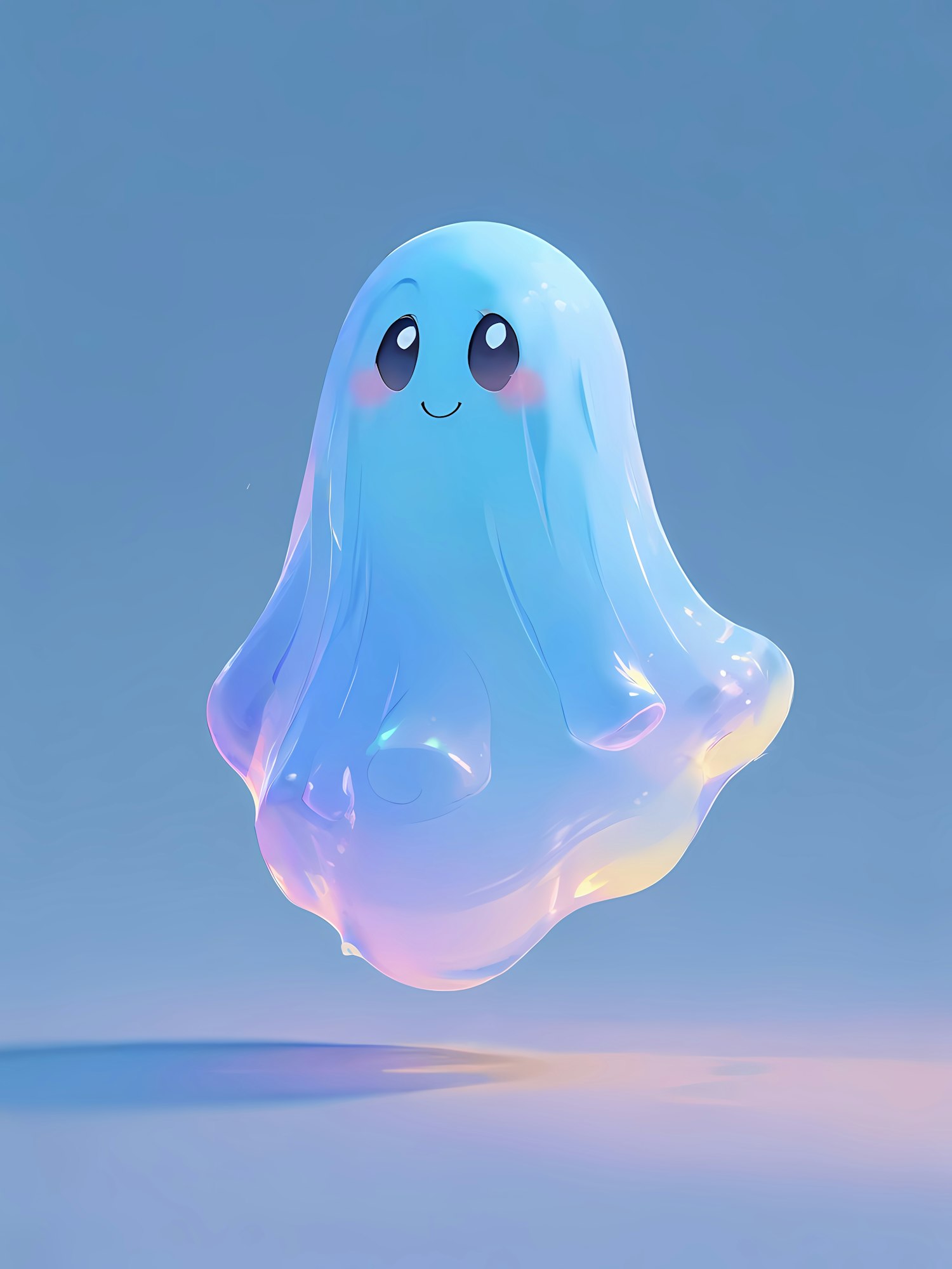 Adorable 3D jelly-like ghost with glowing pastel hues, big eyes, and a cheerful smile floating on a soft blue background.