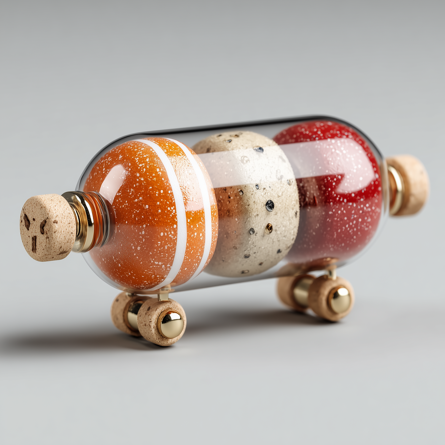 A glass capsule with colorful spheres inside, mounted on wheels, creating a whimsical and artistic design against a neutral background.