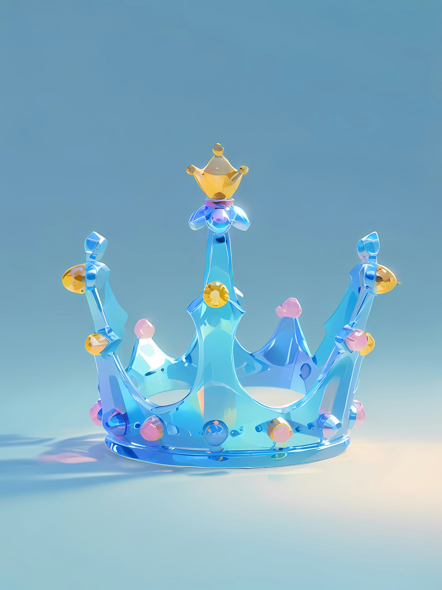 A whimsical glass-like blue crown adorned with colorful gemstones and a golden centerpiece, set against a dreamy light blue background.
