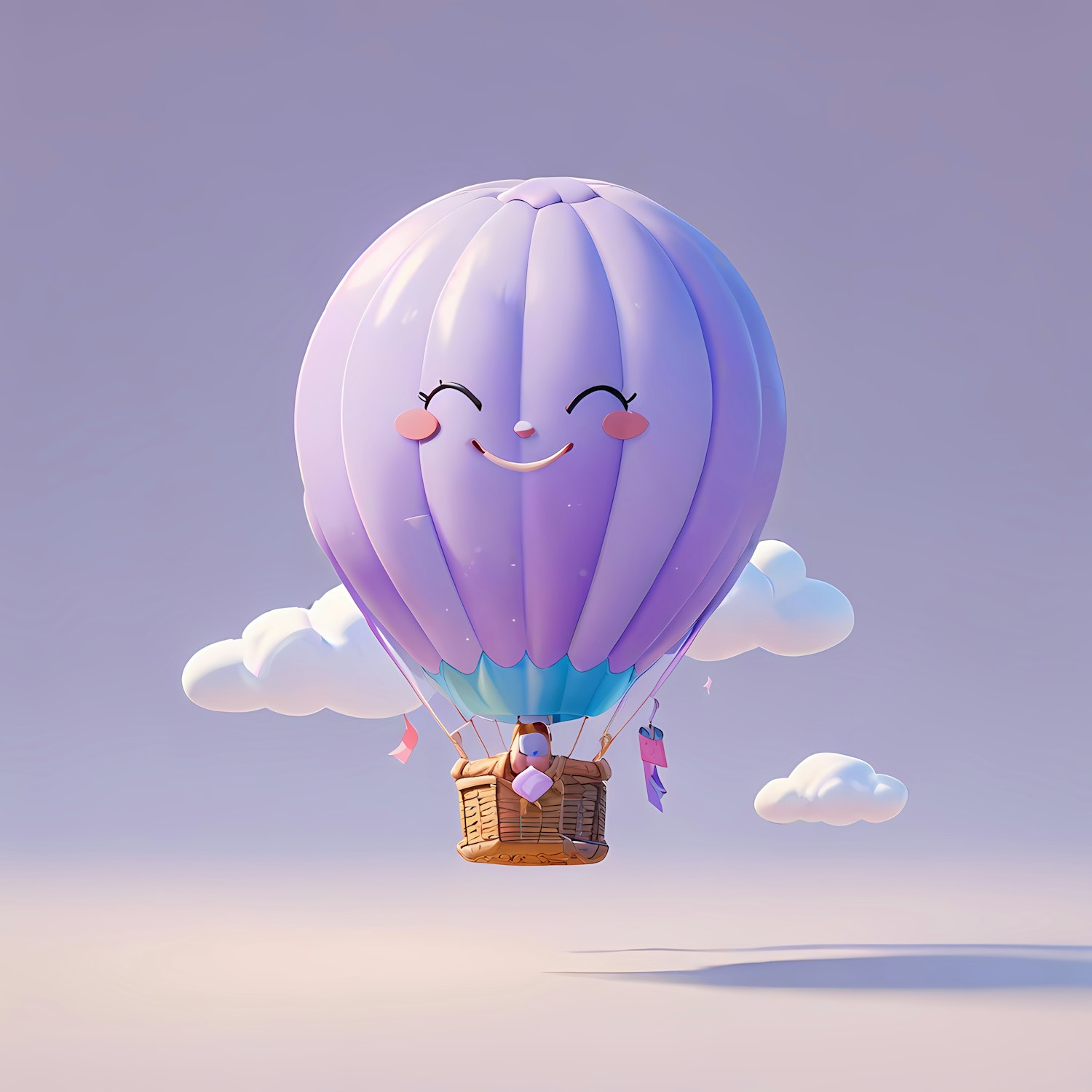 Charming 3D illustration of a smiling lavender hot air balloon with a teddy bear in the basket, floating among fluffy clouds.