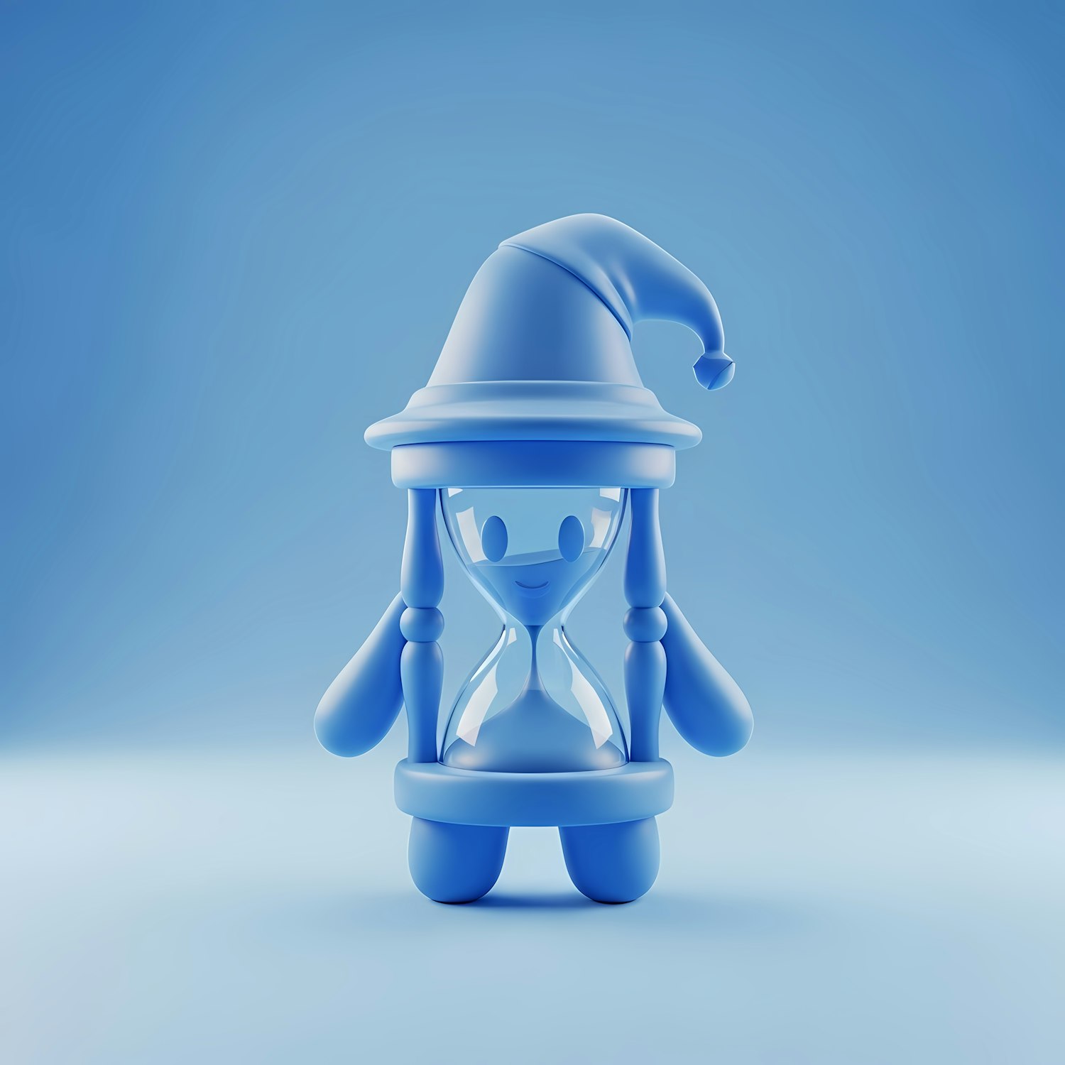Charming 3D illustration of a blue hourglass character with a wizard hat, set against a soft blue gradient background.