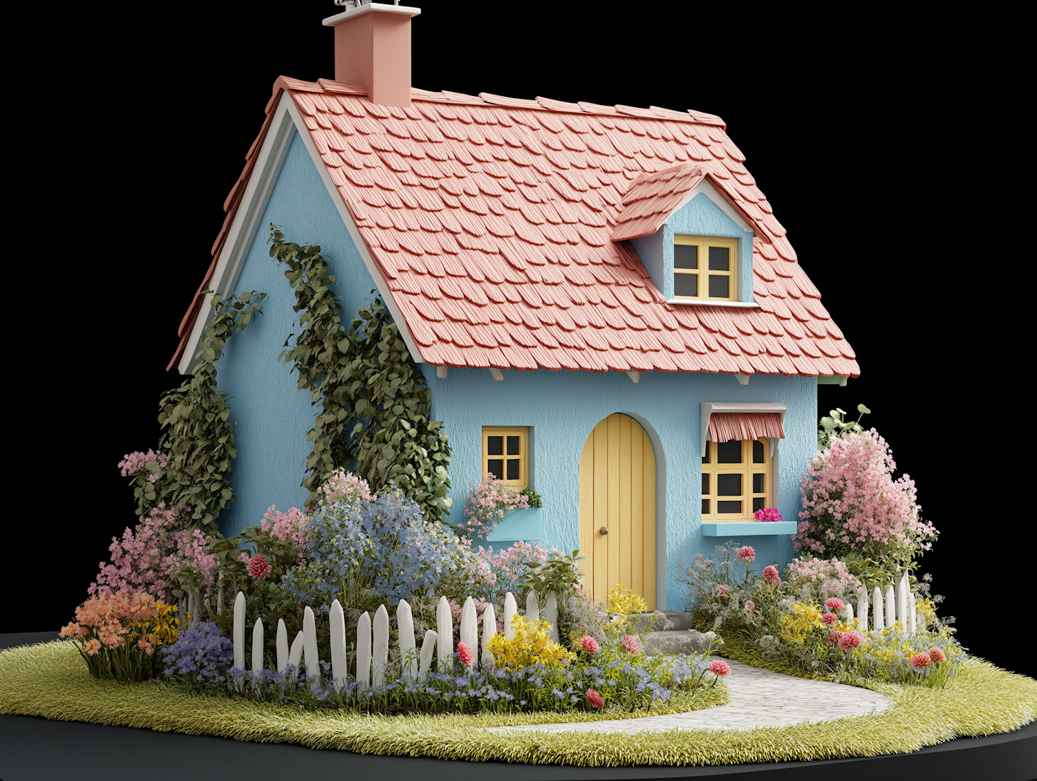 Charming blue house with red roof, yellow accents, and lush garden. Surrounded by colorful flowers and a white picket fence.