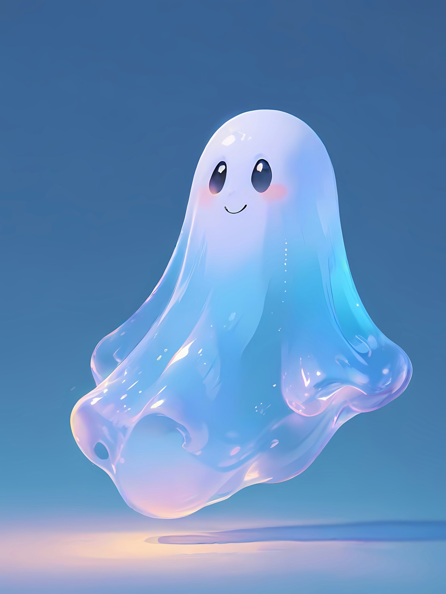 Adorable jelly-like ghost with pastel hues and a cheerful smile floating in a dreamy blue background. Perfect for a whimsical vibe!