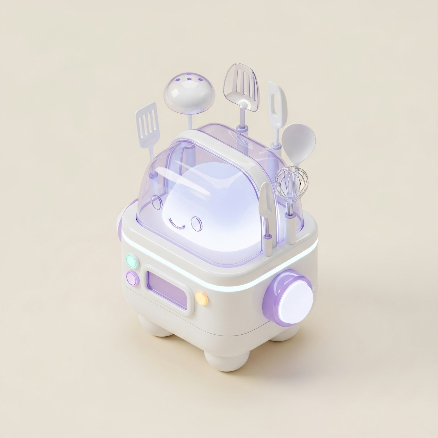 Adorable 3D-rendered kitchen gadget with a smiling face, purple accents, and utensils under a transparent dome. Perfect for a modern kitchen.