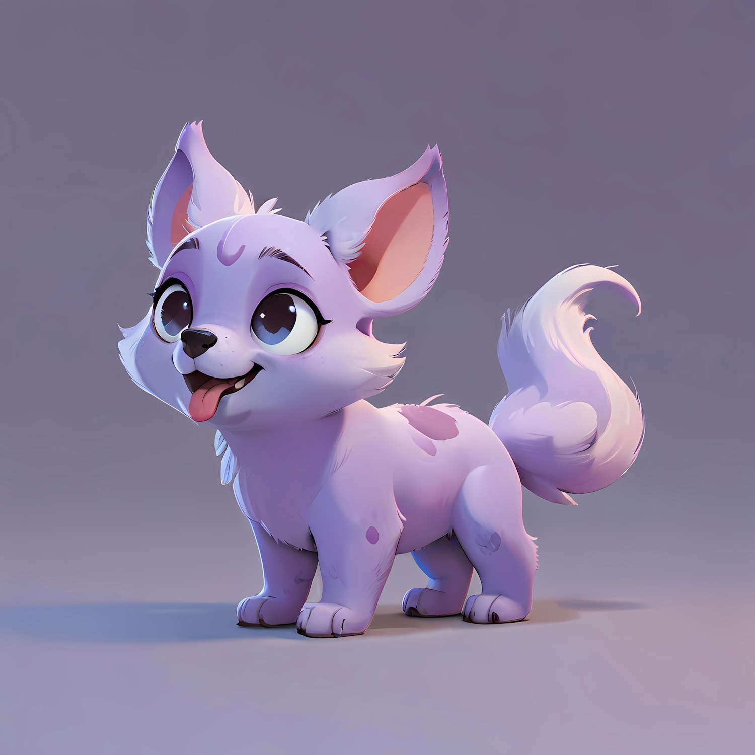 Adorable cartoon purple puppy with big eyes and fluffy tail, set against a soft purple background. Perfect for kids' illustrations.
