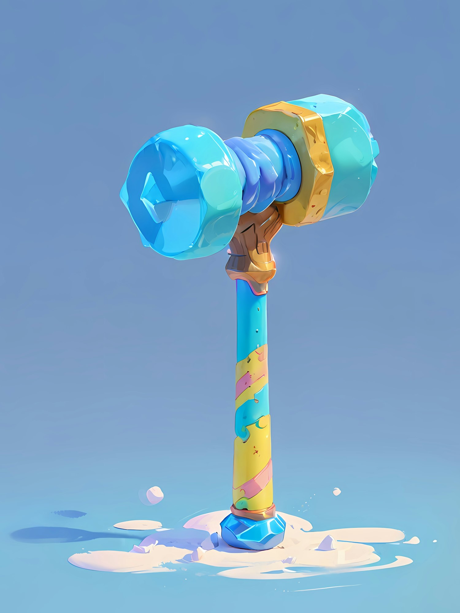 Whimsical cartoon hammer with a gem-like blue head, pastel handle, and golden accents, surrounded by white splashes on a blue background.