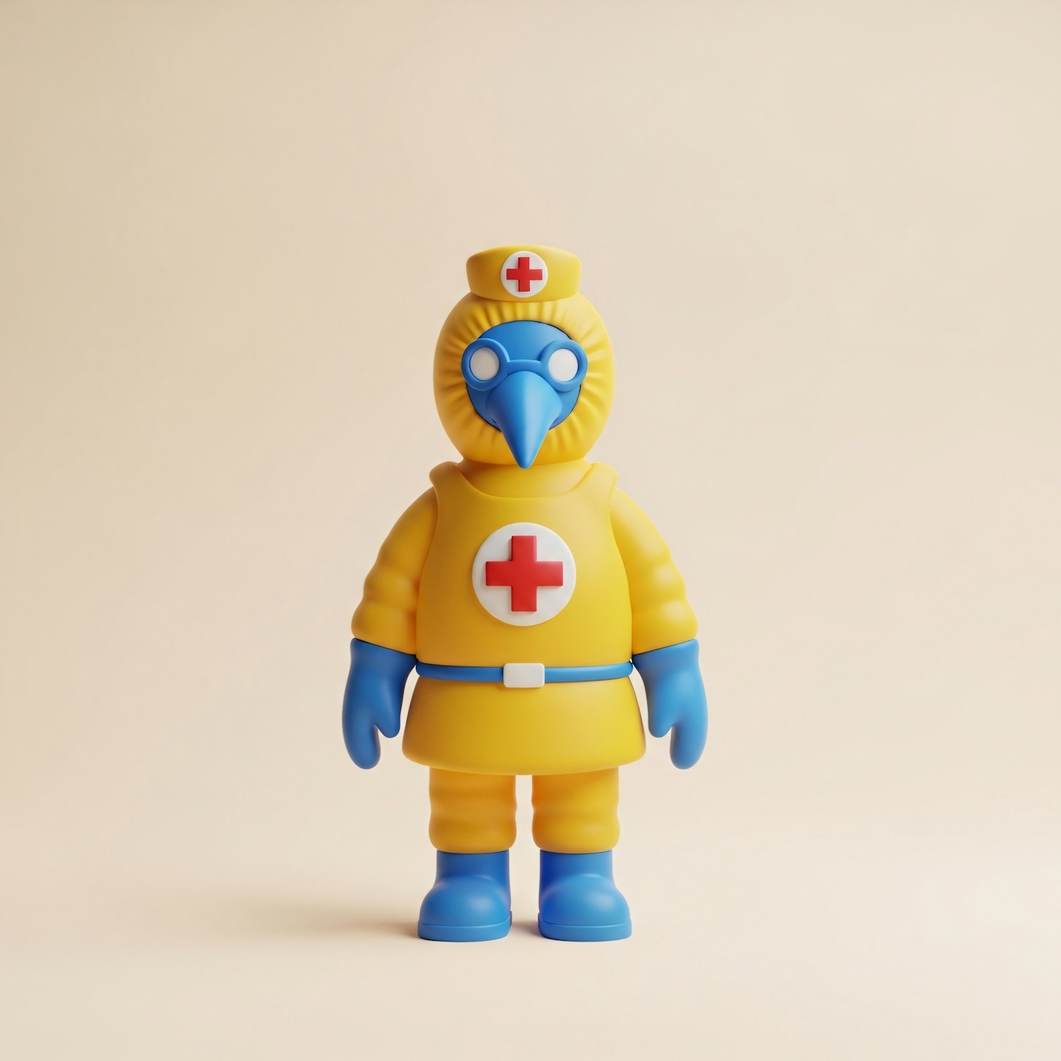 A colorful toy figure in a yellow and blue medical outfit with a bird-like mask and red cross emblem, set against a neutral background.