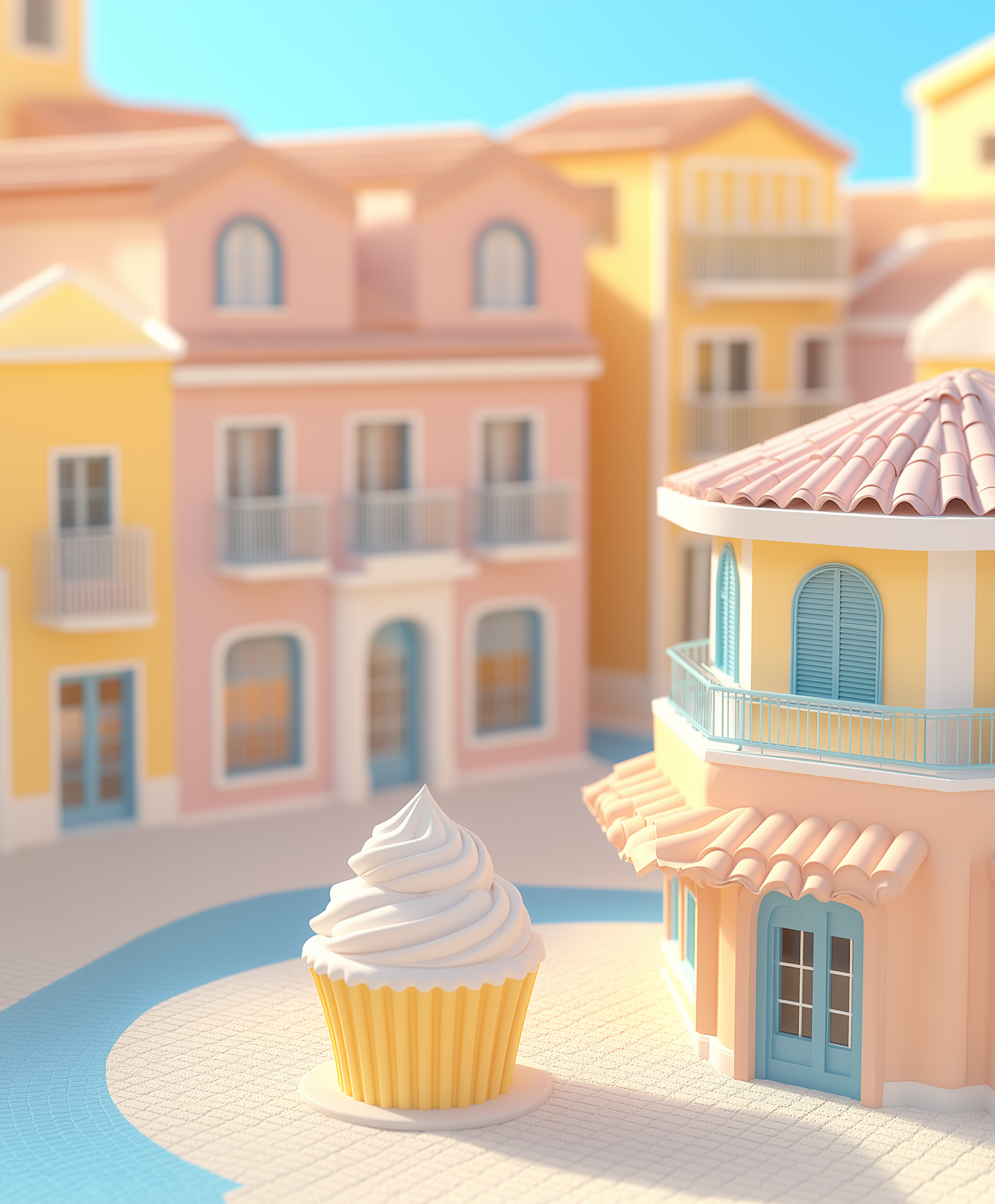 Whimsical scene with pastel buildings and a giant cupcake, featuring Mediterranean architecture and a surreal, cheerful atmosphere.