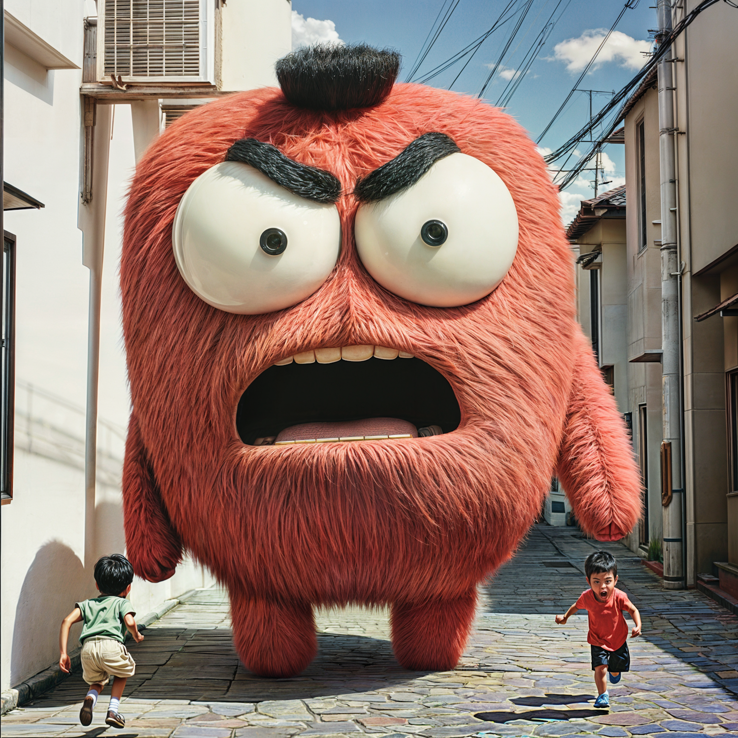 A giant, furry red monster with bulging eyes chases two kids down a sunny alleyway, blending humor and fantasy in a realistic urban setting.