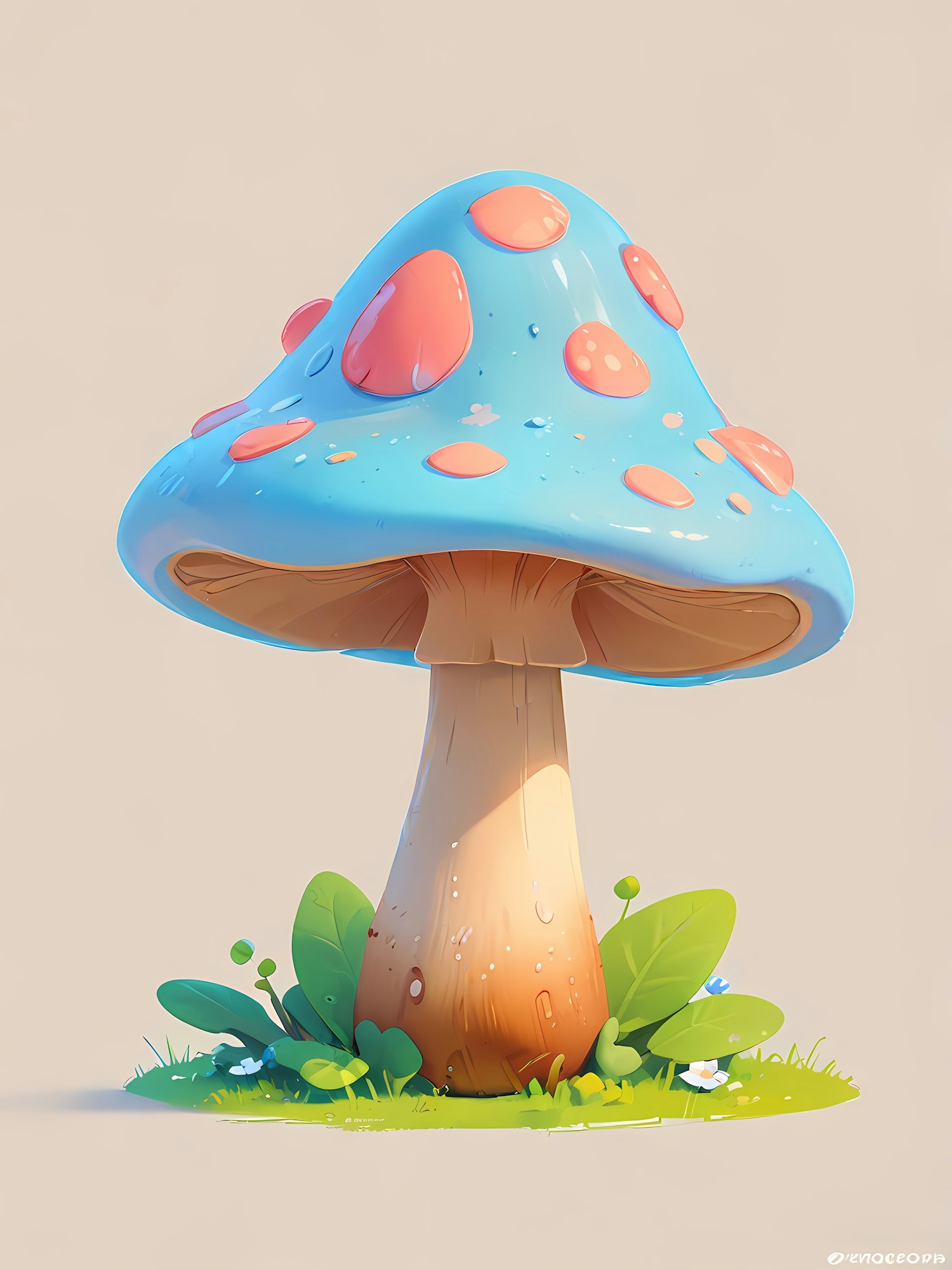 A vibrant blue mushroom with pink spots, surrounded by green leaves and flowers, in a whimsical cartoon style.