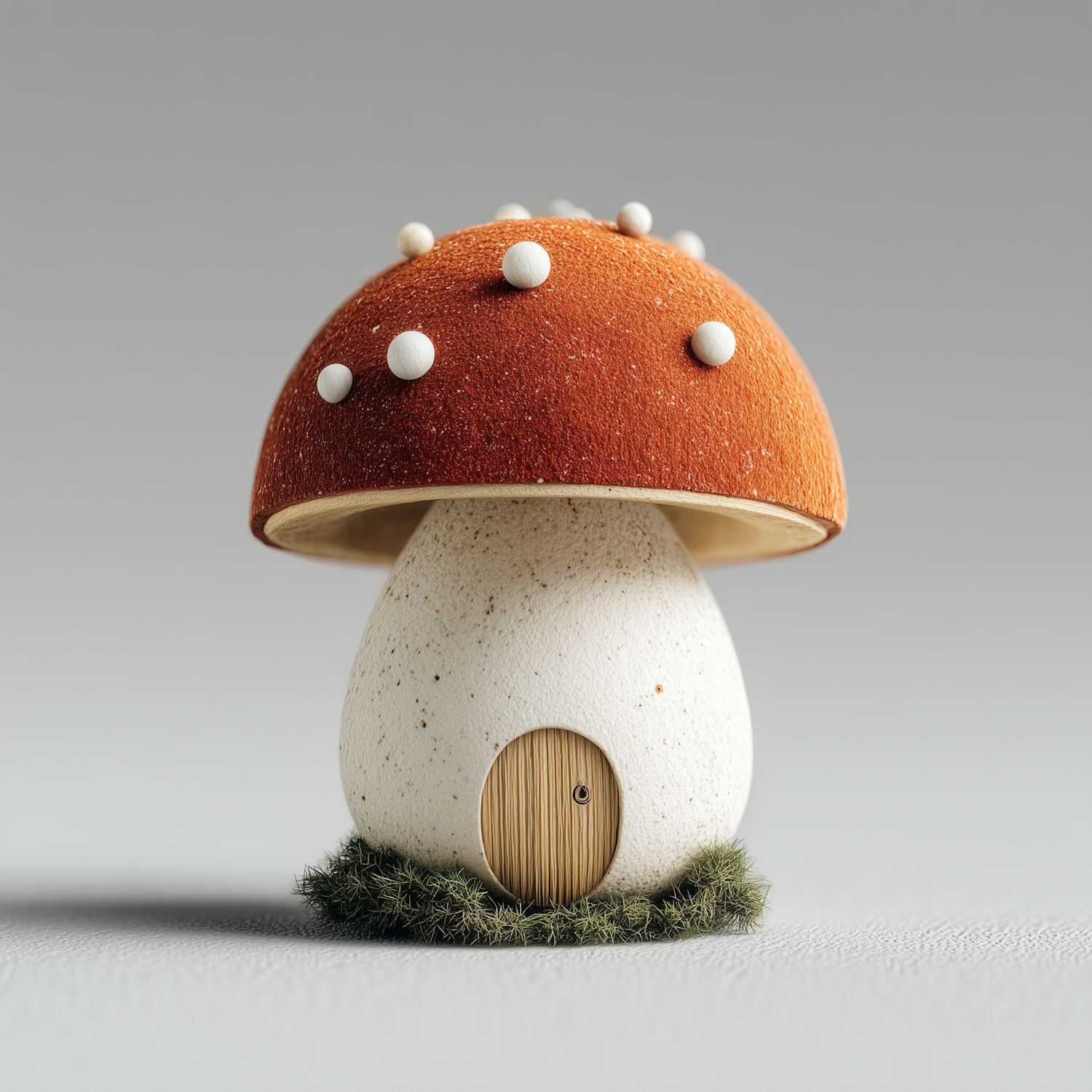 A charming 3D mushroom house with a red cap, white spots, and a tiny wooden door, set on a soft mossy base.