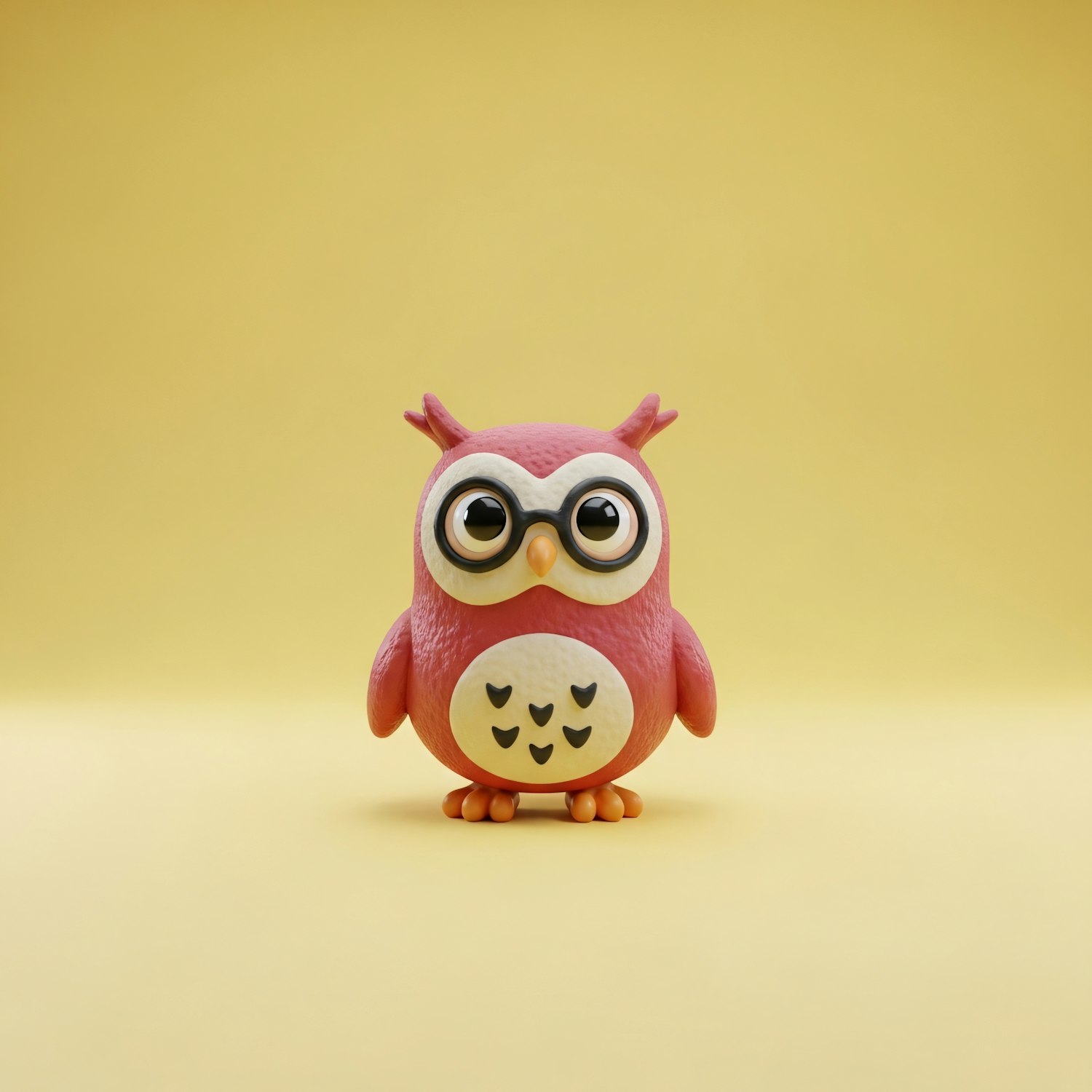 Adorable pink owl figurine with glasses on a bright yellow background, perfect for adding charm to any decor or design project.
