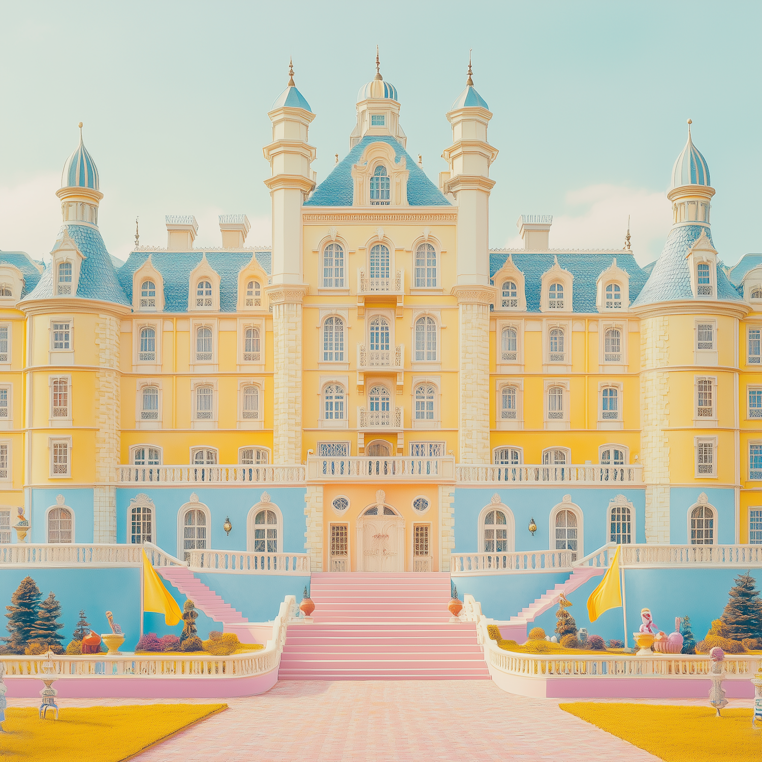 Whimsical pastel castle with turrets and gardens under a clear sky, creating a dreamy fairy-tale atmosphere.
