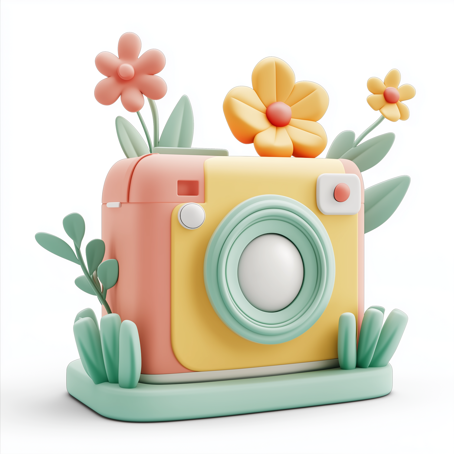 Whimsical 3D illustration of a pastel vintage camera with colorful flowers and leaves, blending technology and nature.