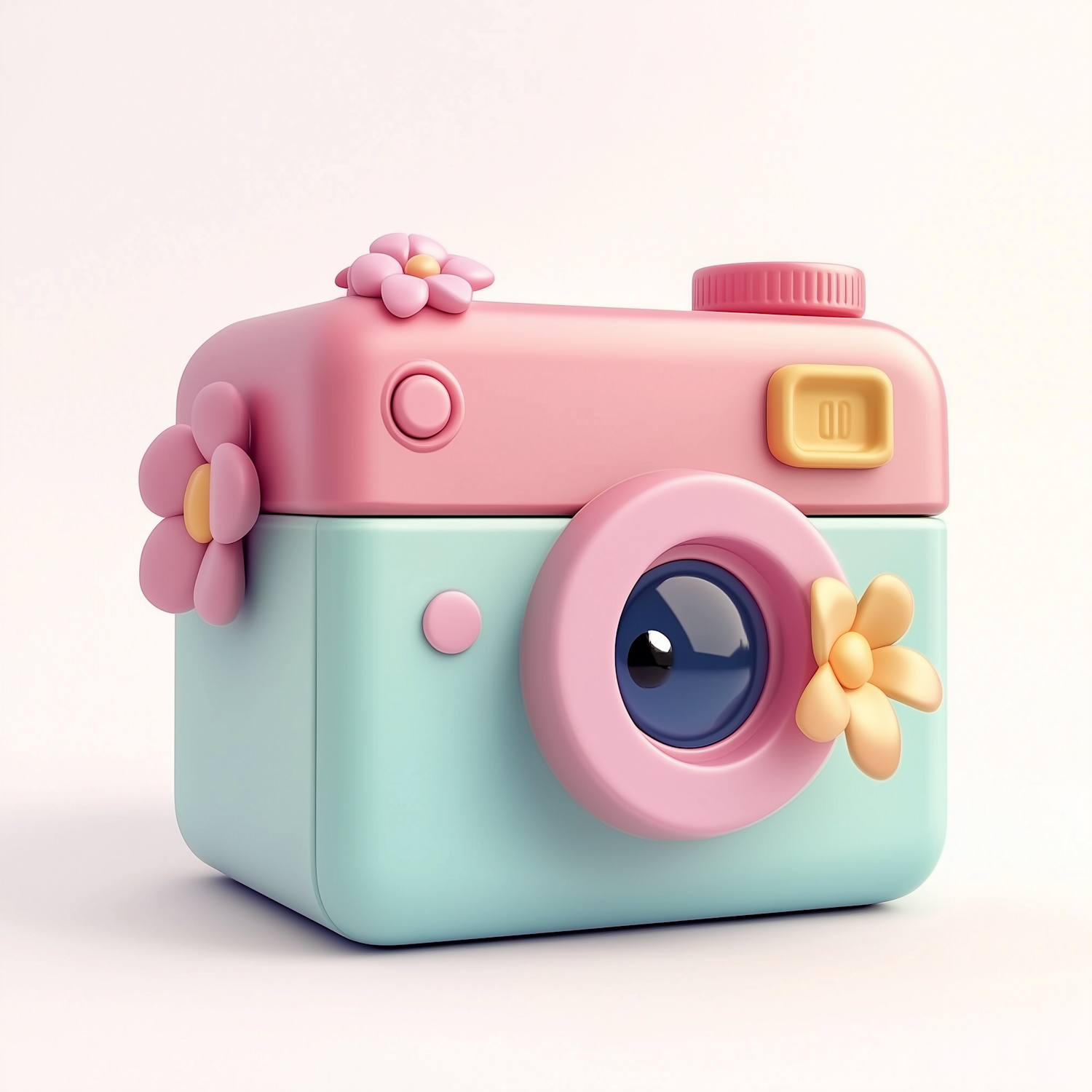 A pastel-colored toy camera with flower decorations, featuring a pink and turquoise body and a glossy lens.