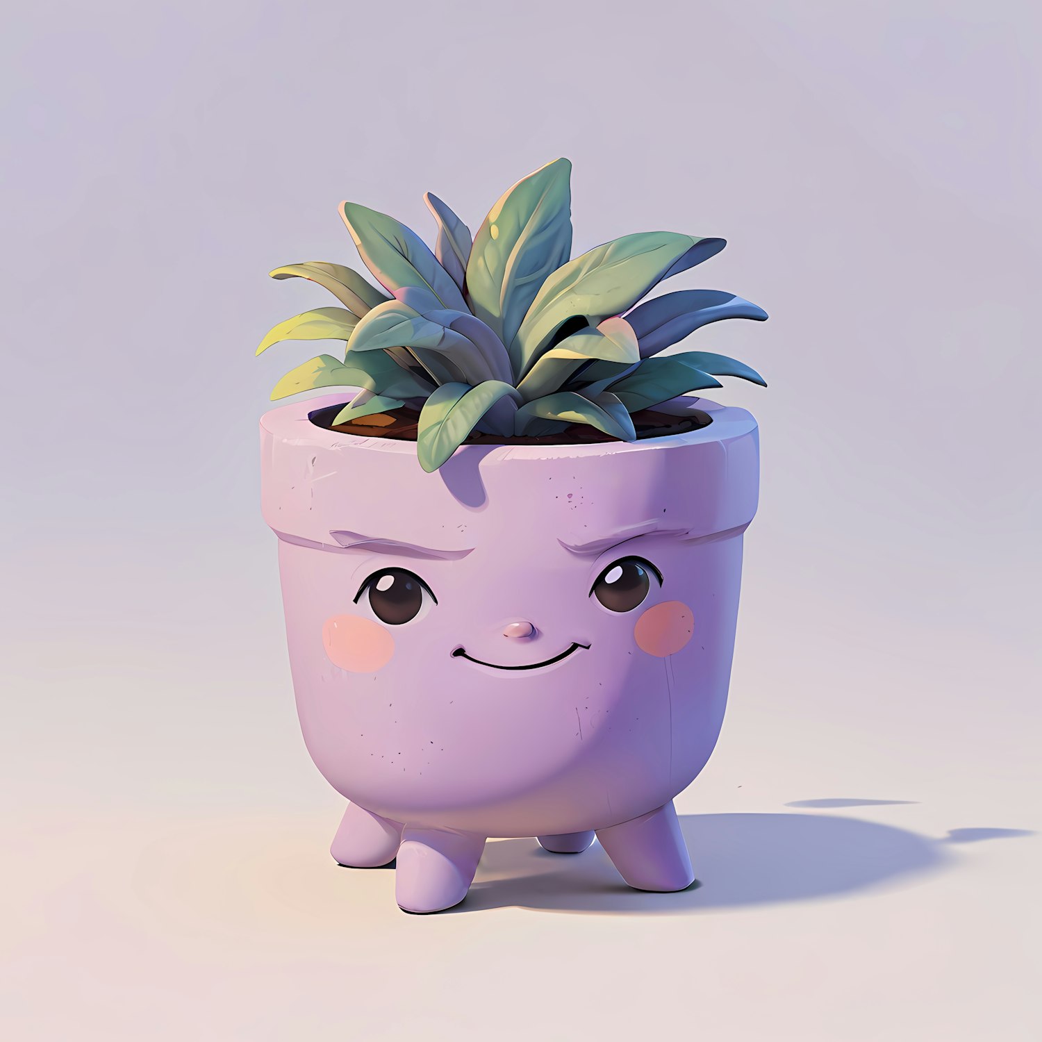 Charming 3D illustration of a purple plant pot with a playful face and lush green leaves, exuding a whimsical and cheerful vibe.