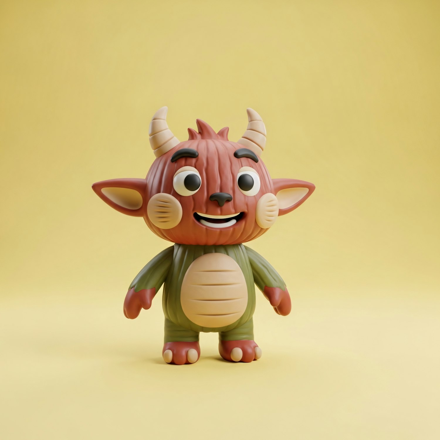 A cute 3D-rendered cartoon character with a pumpkin head and green body, set against a yellow background, perfect for kids' content.