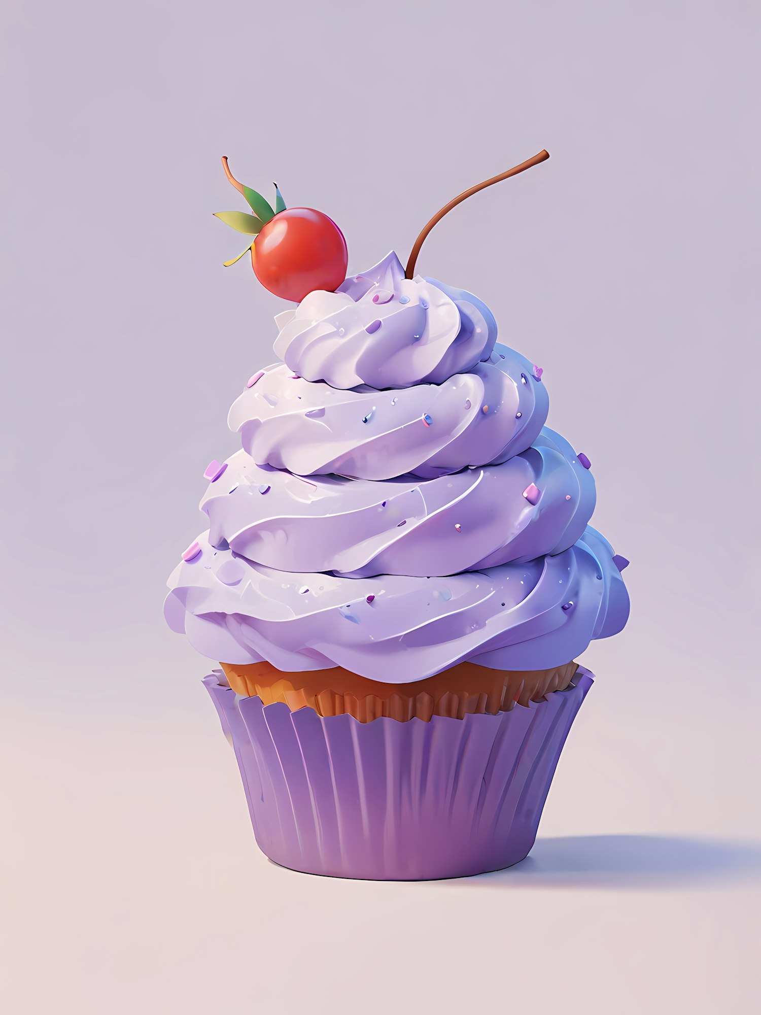A whimsical cupcake with purple frosting, colorful sprinkles, and a cherry on top, set against a soft lavender background.