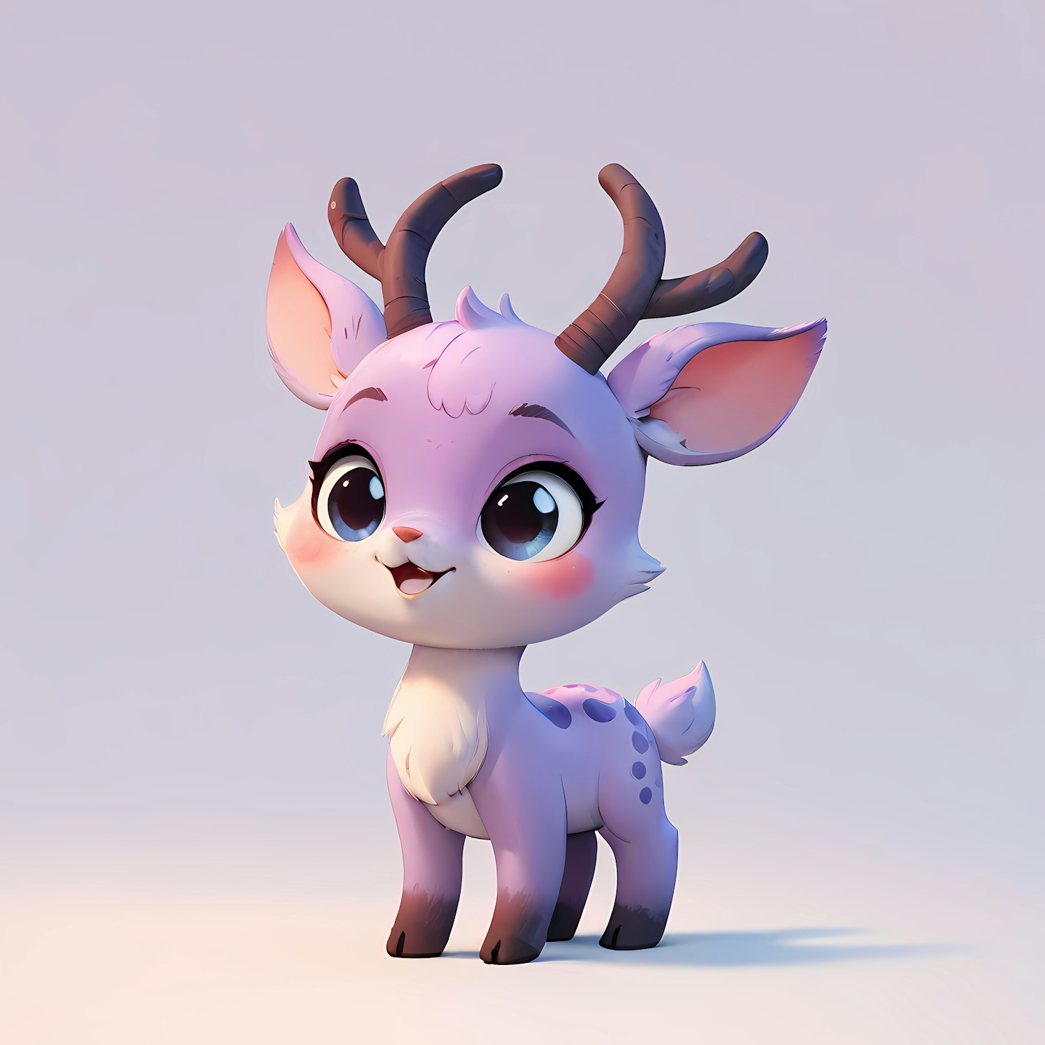 Adorable cartoon baby deer with pastel purple fur and big eyes, featuring small antlers and a cute smile. Perfect for kids' illustrations.