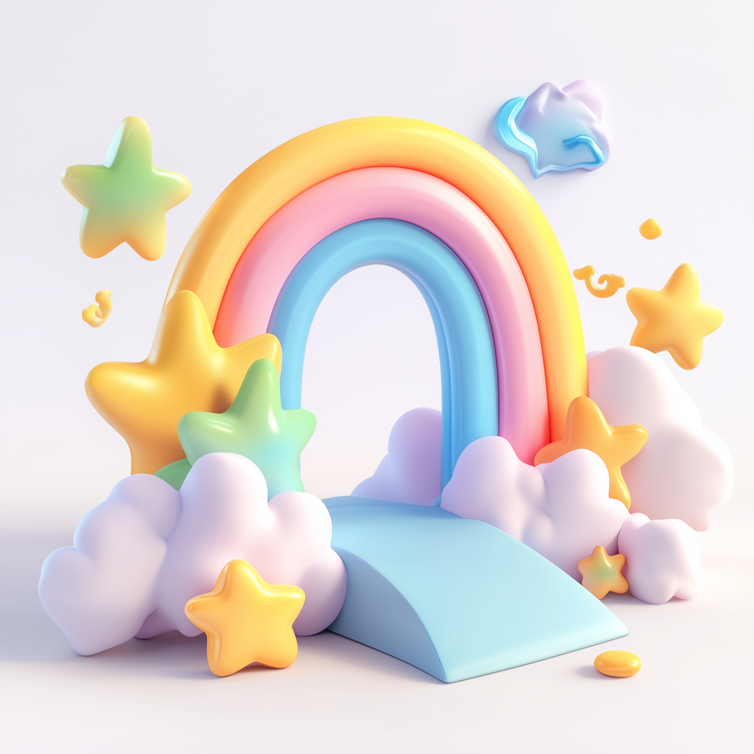 Whimsical 3D illustration of a pastel rainbow with stars and clouds, creating a dreamy and playful atmosphere.