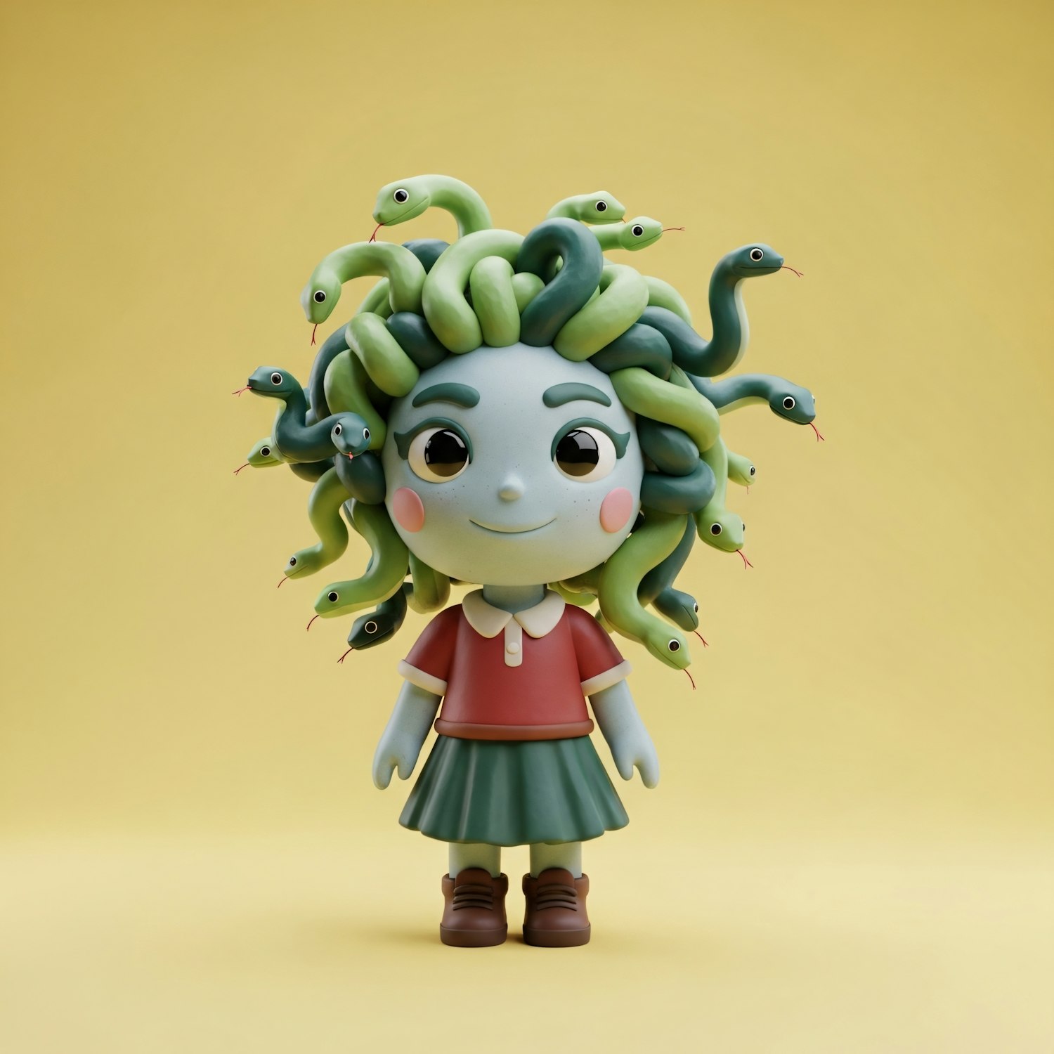 Adorable 3D character with snake hair, a red shirt, and a green skirt, set against a bright yellow background.