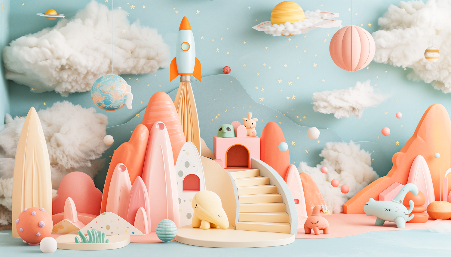 Whimsical pastel landscape with cartoon elements, featuring a rocket, fluffy clouds, and cute animal figures in a dreamy setting.