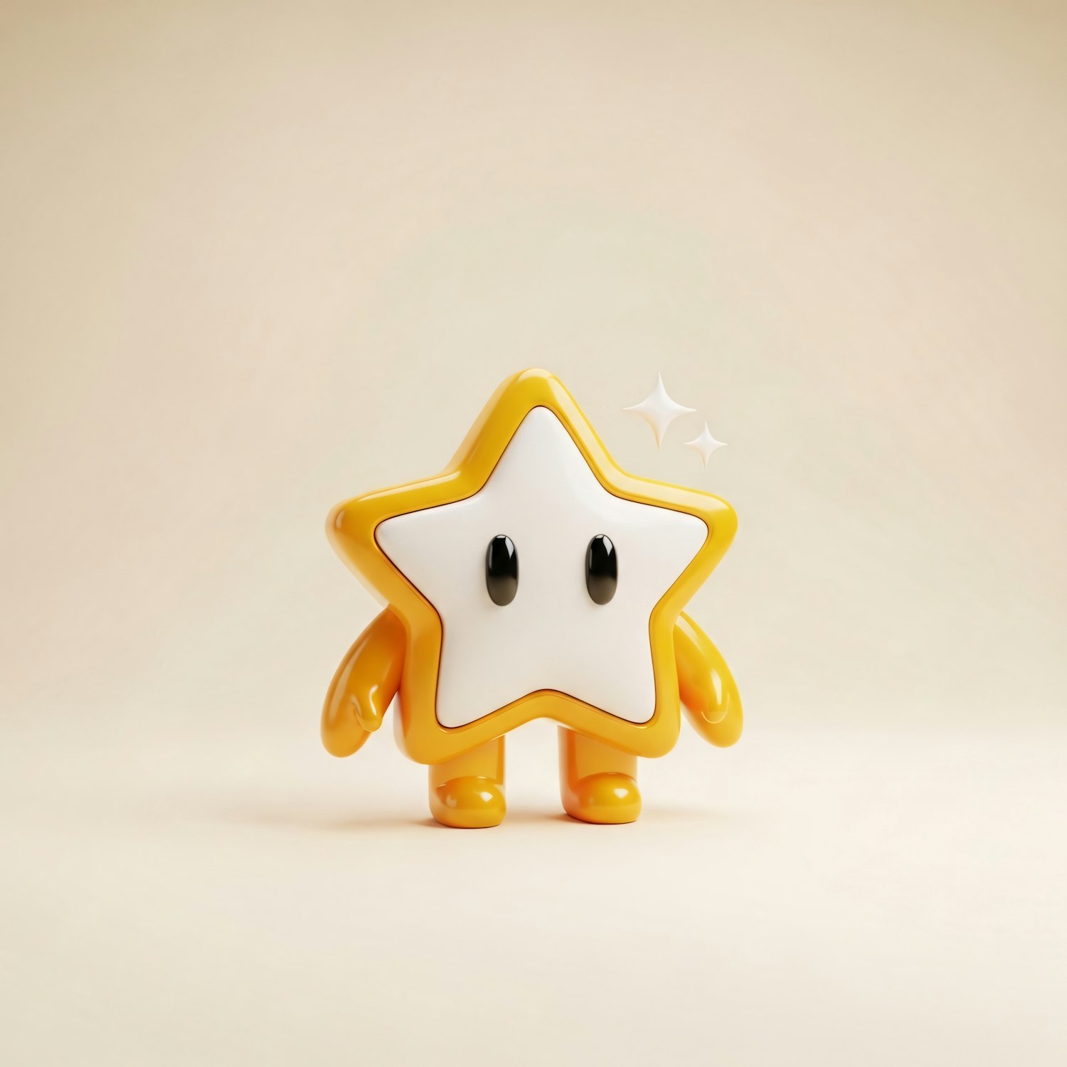 A cute 3D star character with a glossy finish, small black eyes, and a playful design, set against a soft beige background.