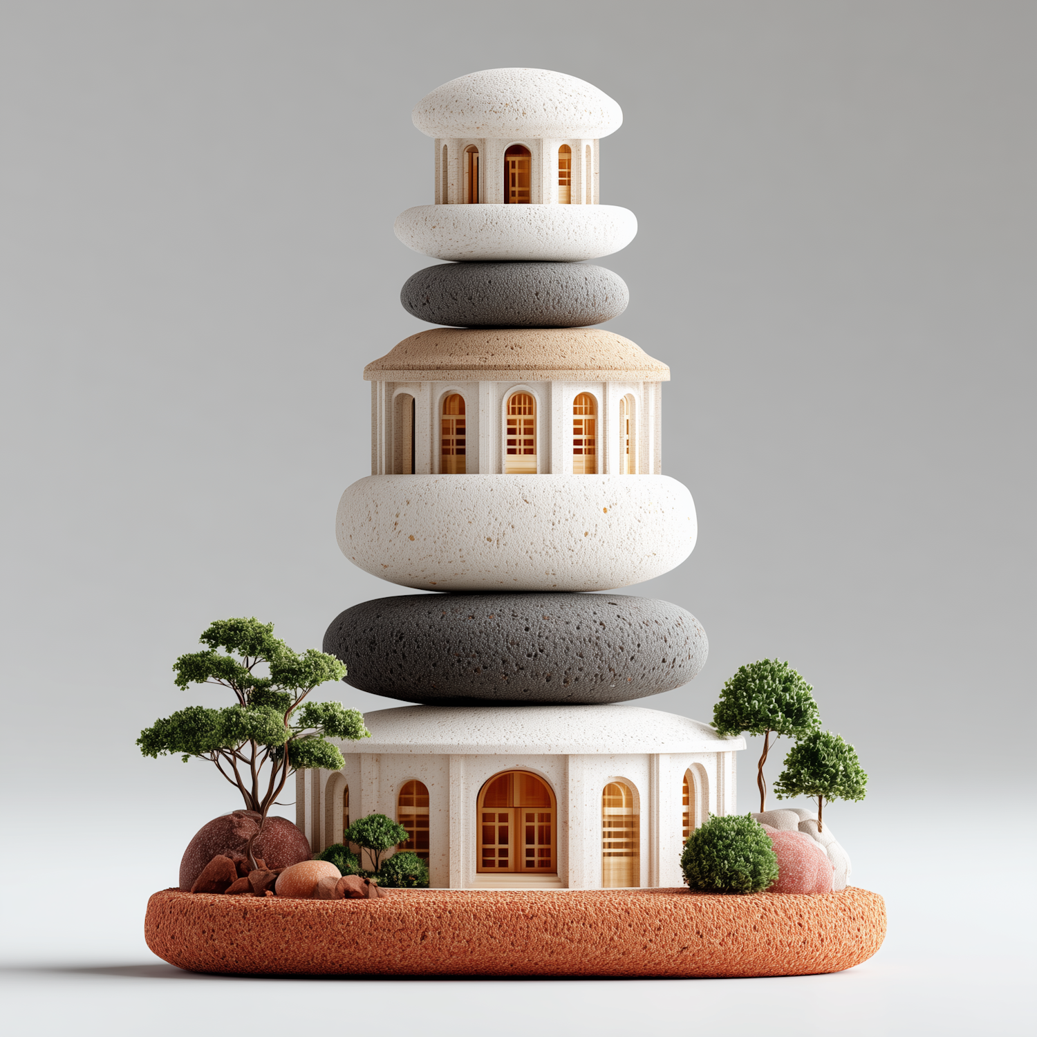 A creative tower design made of stacked stones with windows and a miniature landscape, blending natural and architectural elements.