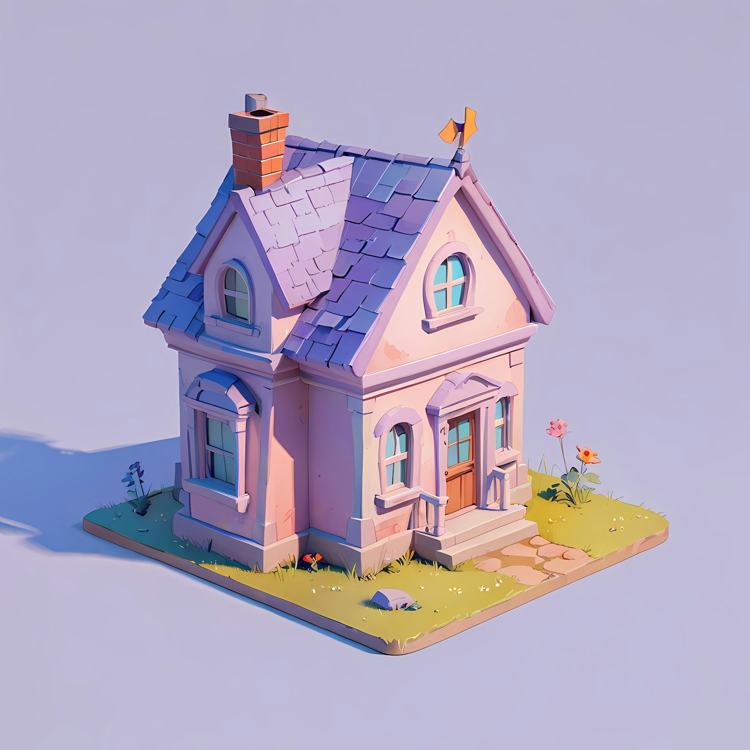 Charming pastel pink house with purple roof, arched windows, and colorful flowers. Whimsical design on a grassy patch.