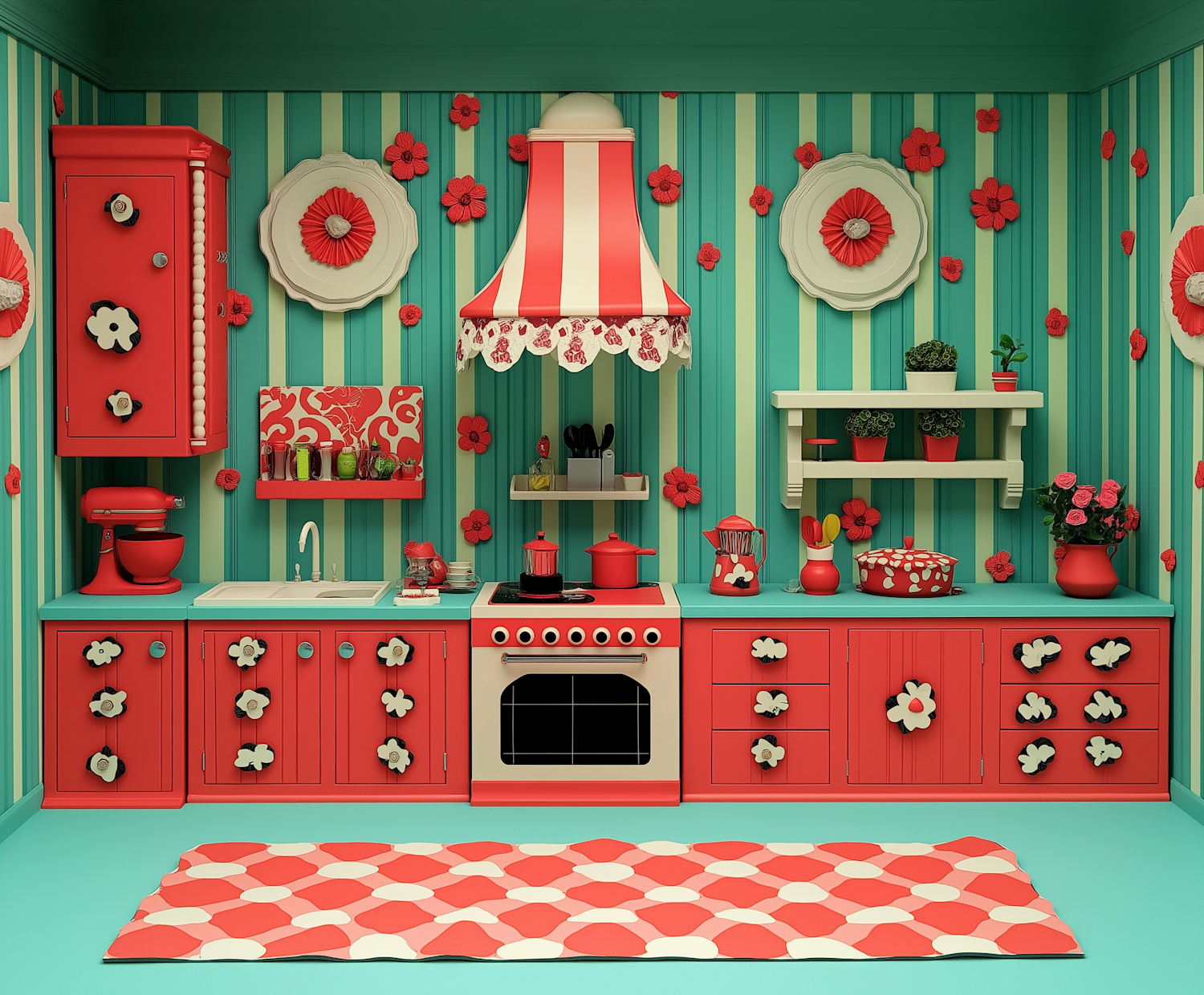 Whimsical retro kitchen with bold red and teal colors, floral accents, and vintage charm. Striped walls and playful decor create a lively scene.