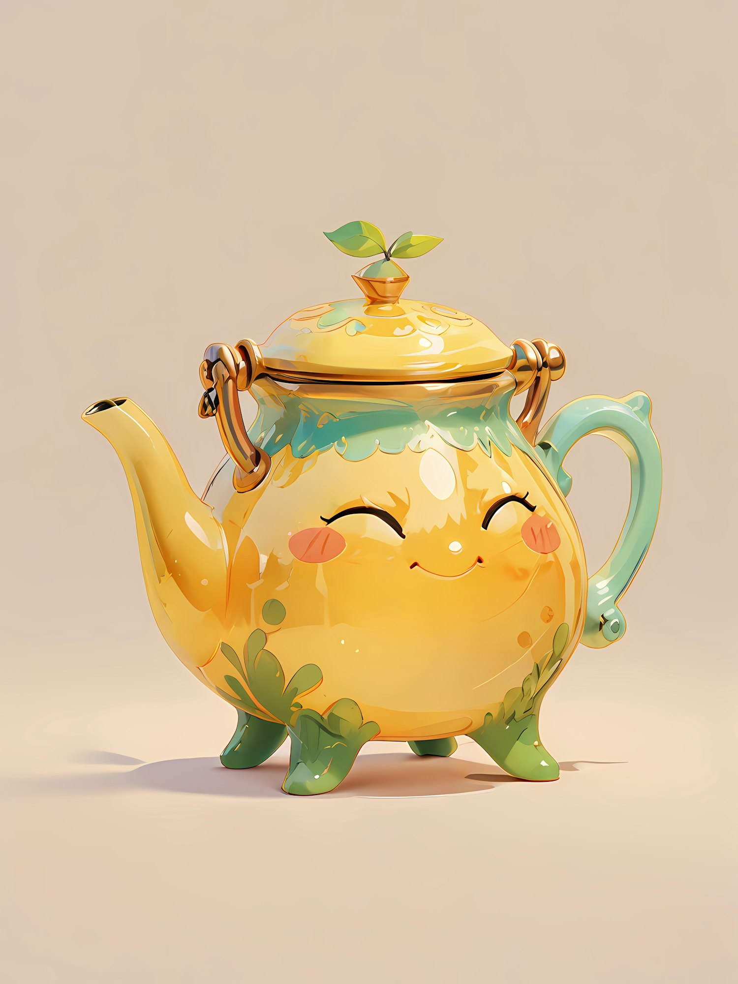 Adorable yellow teapot with a smiling face, green leaf accents, and a sprout lid. Perfect for adding charm to your tea time or decor.