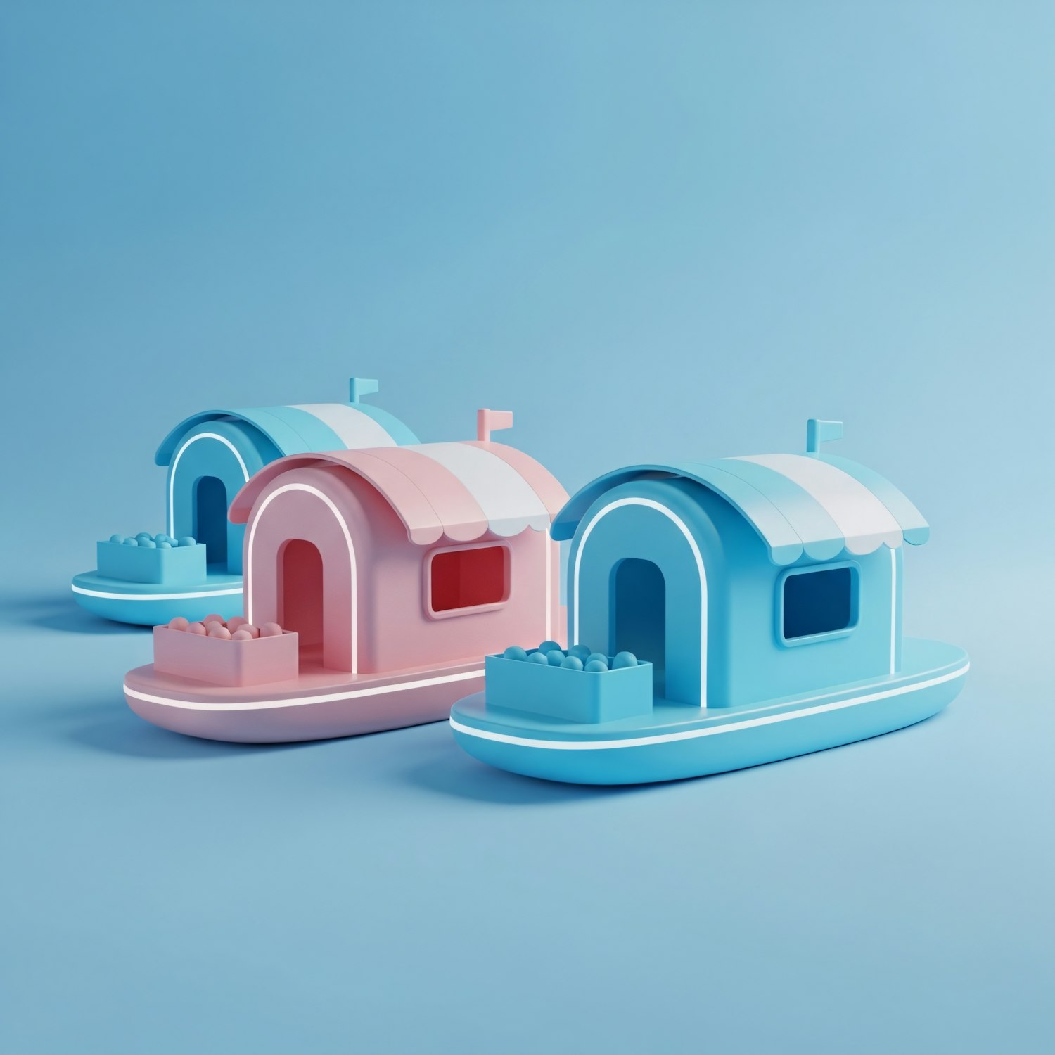 Colorful toy boats with house-like structures in pastel blue and pink, set against a light blue background, creating a playful scene.