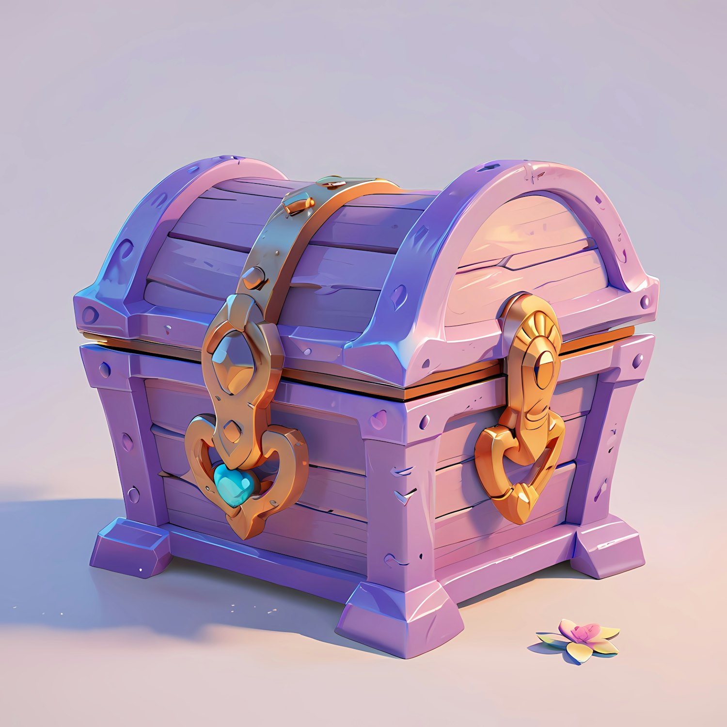 Whimsical purple treasure chest with golden accents and heart lock, set on a smooth surface with a delicate flower nearby.