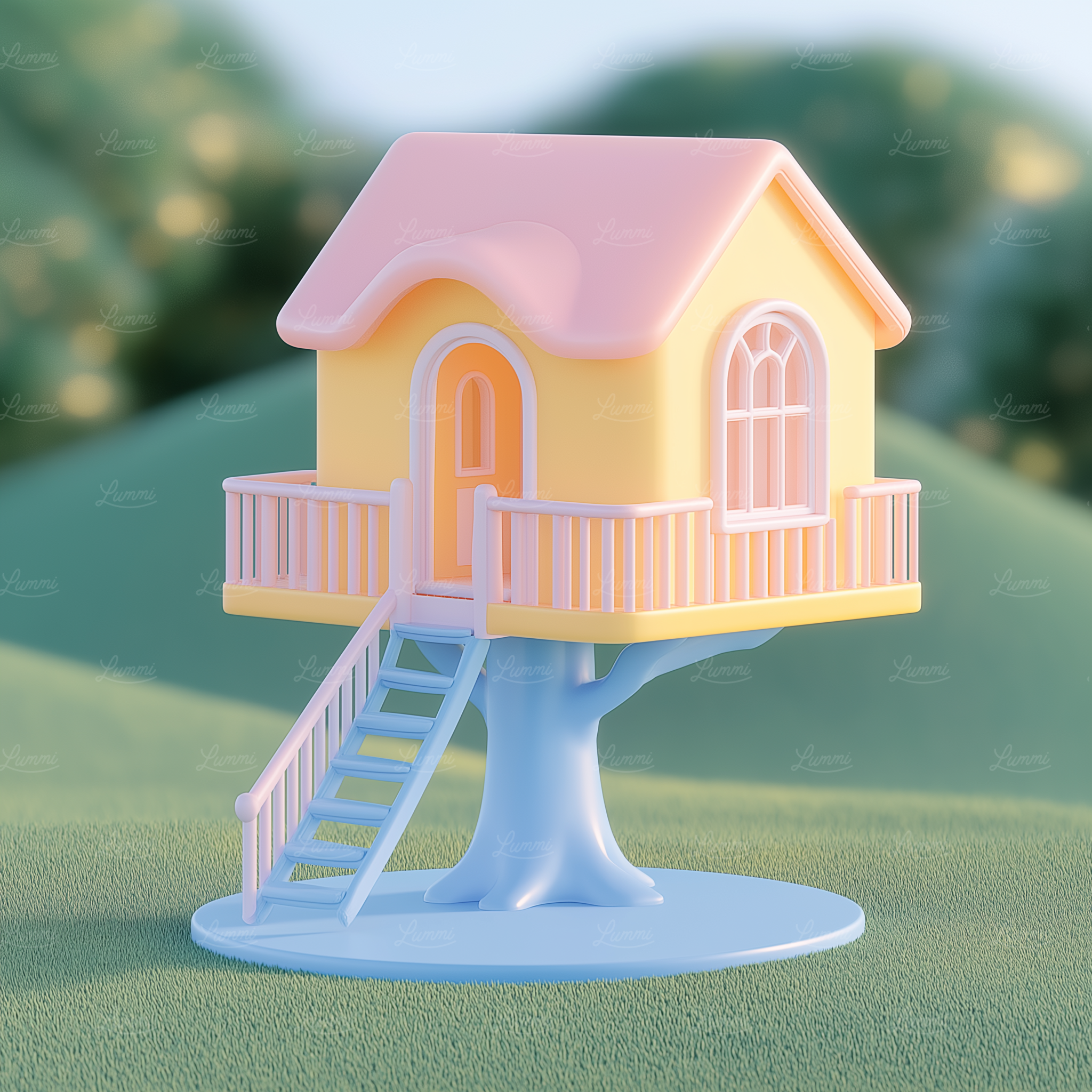Charming 3D illustration of a pastel-colored treehouse with a pink roof and yellow walls, set in a serene, hilly landscape.